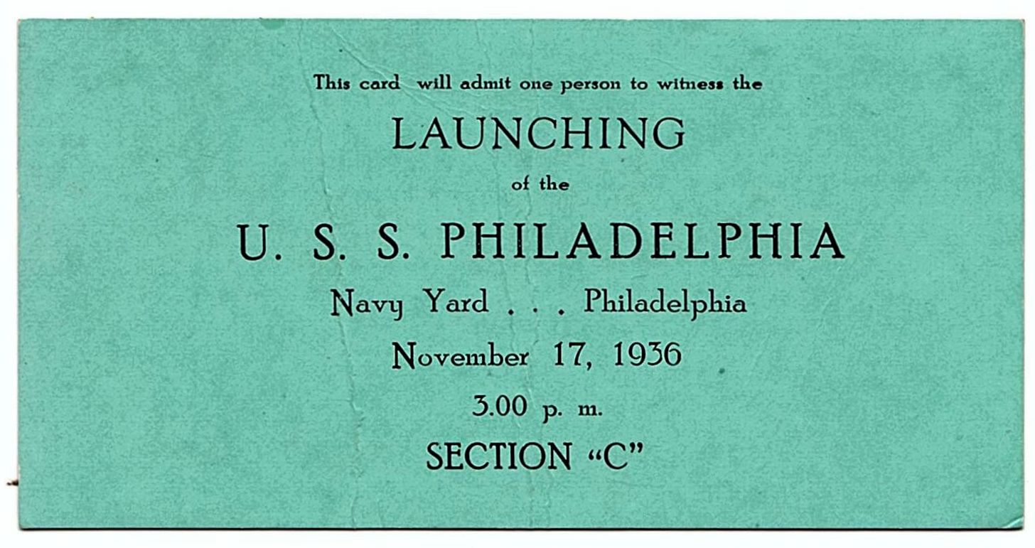 180k | Pass to the launching ceremony for USS Philadelphia. | Dale Hargrave |