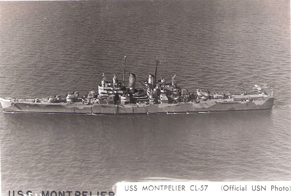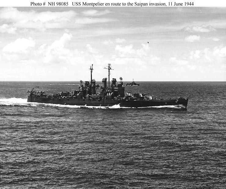 USS Montpelier (CL 57) En route from the Marshall Islands to take part in the invasion of Saipan, 11 June 1944. Photographed from USS Gambier Bay (CVE 73). Official U.S. Navy Photograph, from the Collections of the Naval Historical Center #NH 98085. |