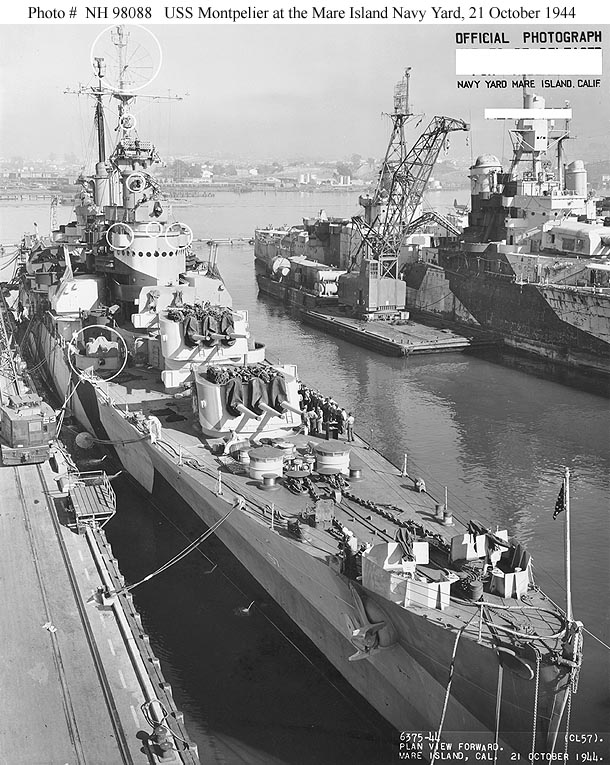 USS Montpelier (CL 57) At the Mare Island Navy Yard, California, at the end of an overhaul, 21 October 1944. The ship in the background, with weathered Measure 32, Design 7d camouflage, is USS Indianapolis (CA 35), which had recently arrived at the Navy Yard for overhaul. Circles mark recent alterations to Montpelier. Official U.S. Navy Photograph, from the Collections of the Naval Historical Center #NH 98088. |