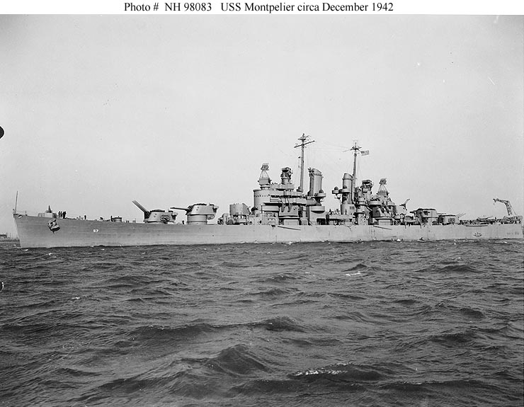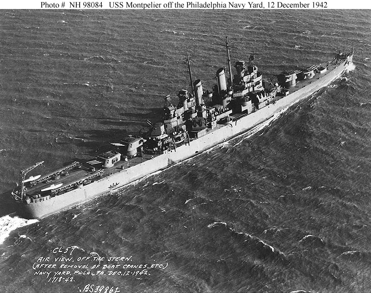 USS Montpelier (CL 57) Photographed circa early December 1942, probably in the vicinity of the Philadelphia Navy Yard, Pennsylvania. Official U.S. Navy Photograph, from the Collections of the Naval Historical Center #NH 98083. |