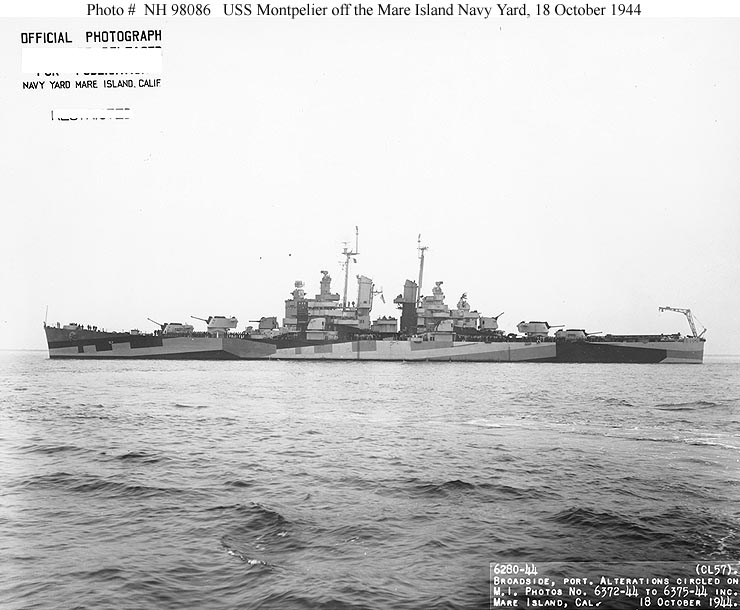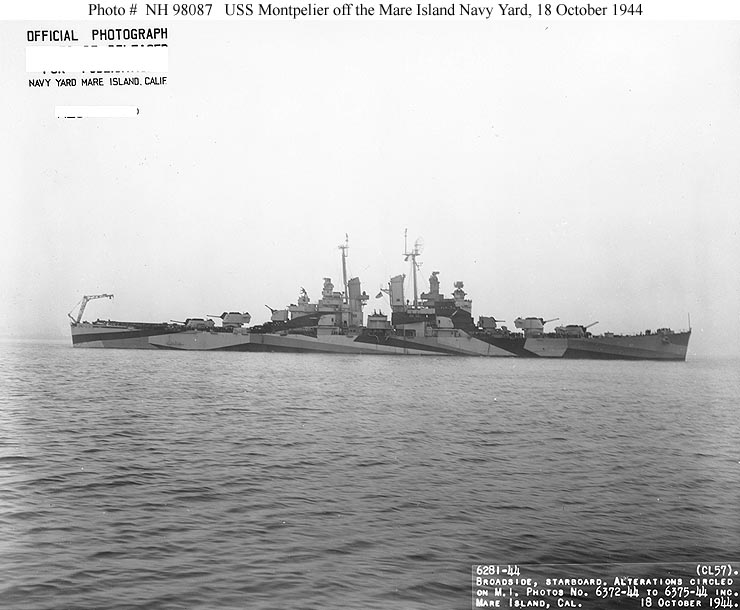 USS Montpelier (CL 57) Off the Mare Island Navy Yard, California, following overhaul, 18 October 1944. Her camouflage scheme is Measure 32, Design 11a. Official U.S. Navy Photograph, from the Collections of the Naval Historical Center #NH 98086. |