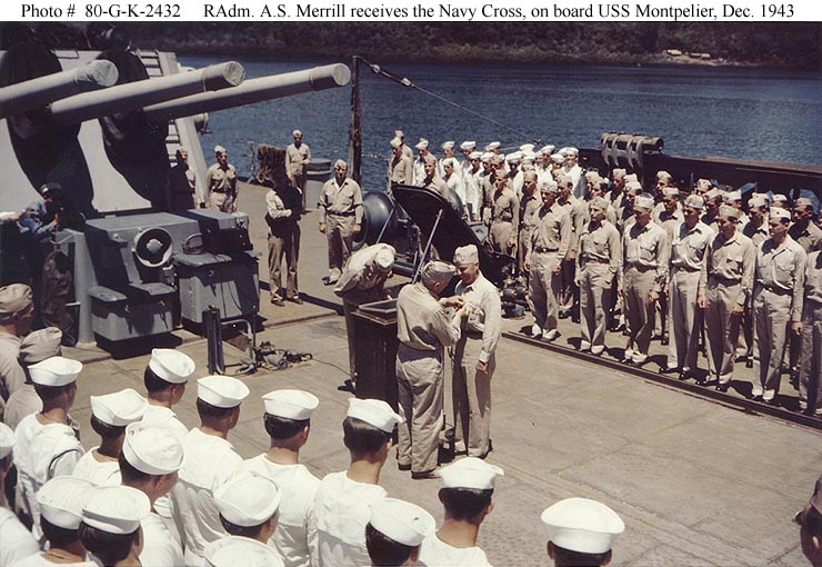 Rear Admiral Aaron S. Merrill, USN Receives the Navy Cross medal from Vice Admiral Aubrey W. Fitch, in ceremonies held on the after deck of USS Montpelier (CL 57), 11 December 1943. Probably taken in Tulagi Harbor, Solomon Islands. Official U.S. Navy Photograph, now in the collections of the National Archives #80-G-K-2432. |