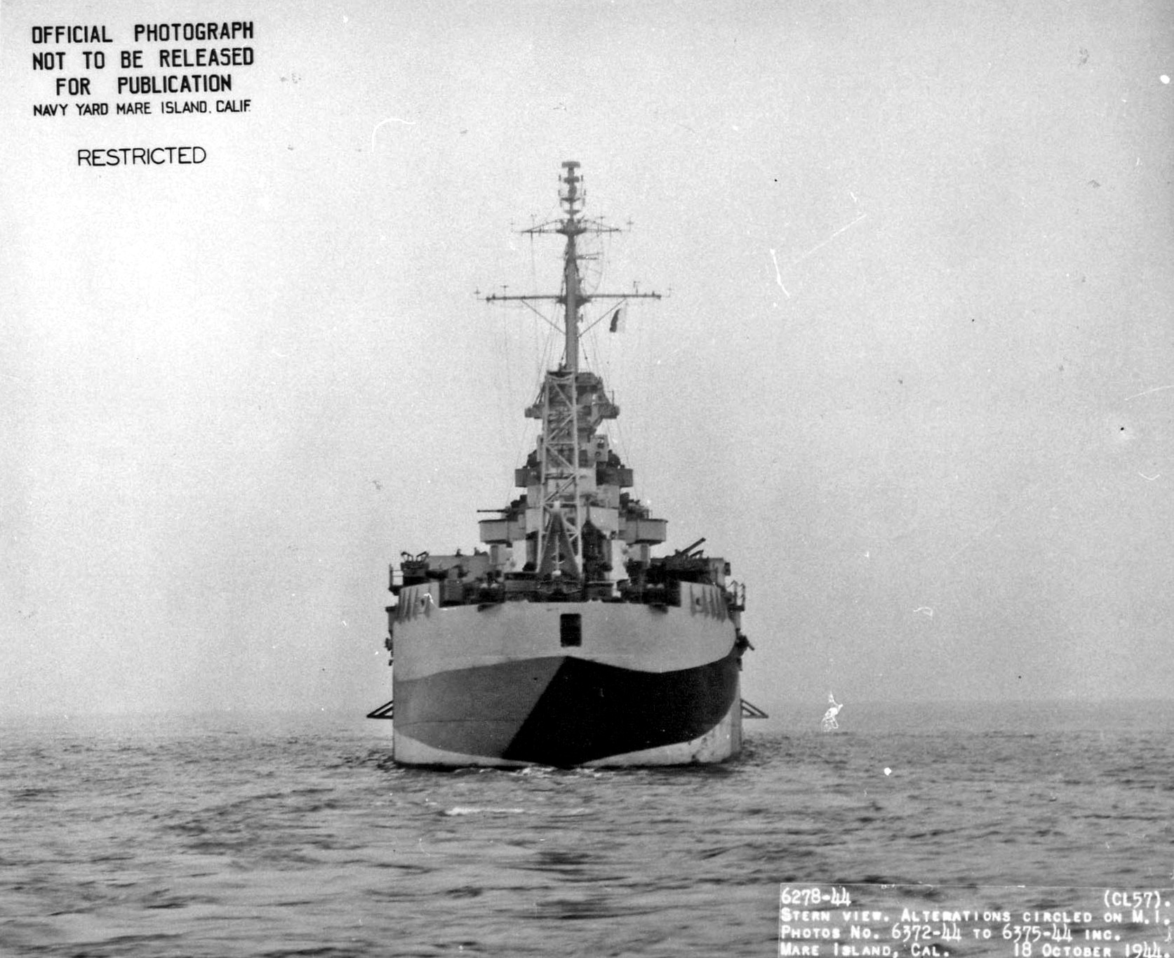 Stern view of USS Montpelier (CL 57) off Mare Island on 18 Oct 44. U.S. Navy Photo #6278-44 |
