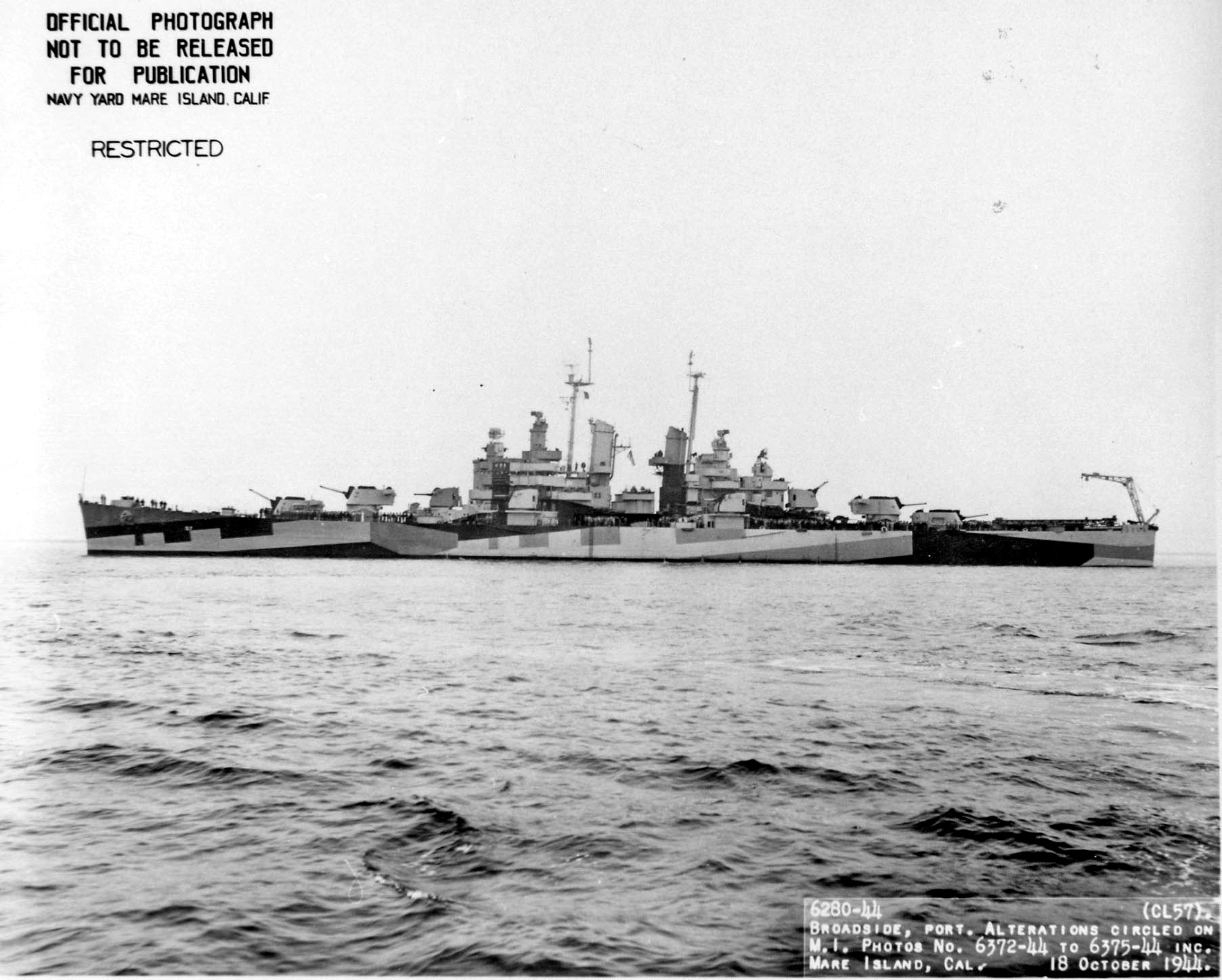 Broadside view of USS Montpelier (CL 57) off Mare Island on 18 Oct 44. She was in overhaul at the shipyard from 22 August to 25 October 1944. U.S. Navy Photo #6375-44 |