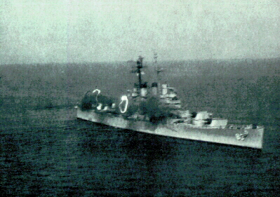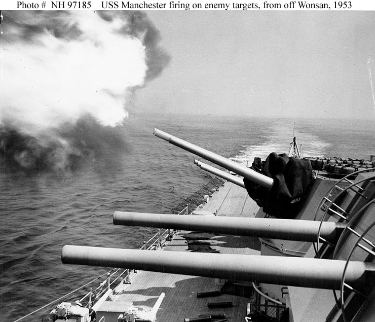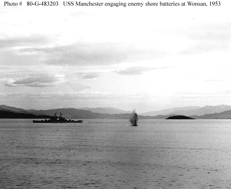 USS Manchester (CL 83) Engaging shore batteries off Wonsan, North Korea. Photo is dated 17 JUN 1953. Note splash from an enemy shell that has hit "over". The small island at right is Hwangto-Do. Official U.S. Navy Photograph, now in the collections of the National Archives #80-G-483203. |