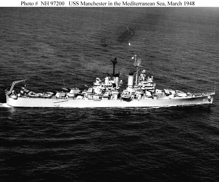 USS Manchester (CL 83) Photographed from a USS Philippine Sea plane while operating in the Mediterranean Sea, 9 MAR 1948. Note that the ship still retained one aircraft catapult at this time. Official U.S. Navy Photograph, from the Collection of Rear Admiral Frederick S. Withington, USN, held by the Naval Historical Center #NH 97200. |