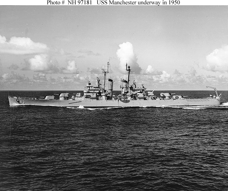 USS Manchester (CL 83) Underway, circa 1950-52, probably in U.S. West Coast waters prior to her first or second Korean War deployments. Official U.S. Navy Photograph, from the collections of the Naval Historical Center #NH 97183. |
