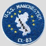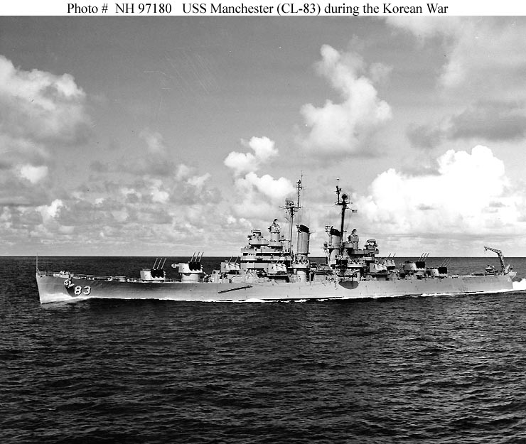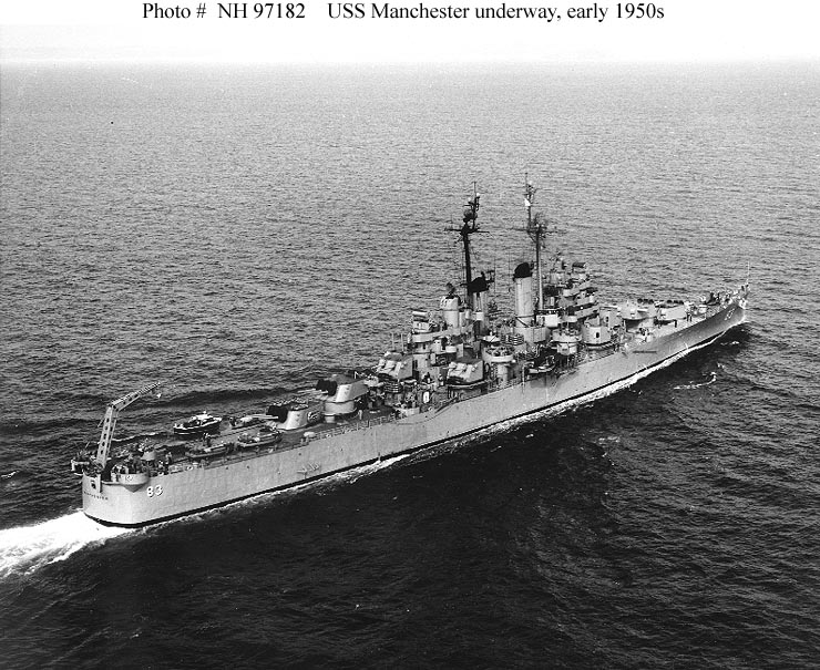 USS Manchester (CL 83) Underway, circa 1950-52, probably in U.S. West Coast waters prior to her first or second Korean War deployments. Official U.S. Navy Photograph, from the collections of the Naval Historical Center #NH 97182. |