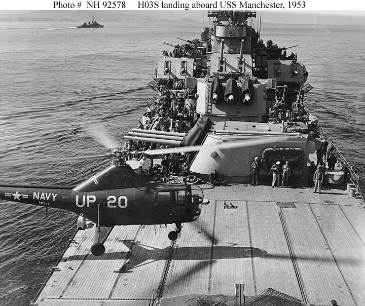 USS Manchester (CL 83) Sikorski HO3S helicopter, of squadron HU-1, lands on the cruiser's after deck after a gunfire spotting mission off the Korean coast, March 1953. Note: Manchester's wooden decking with aircraft tie-down strips and hangar cover tracks; 6"/47 triple gun turrets; 5"/38 and 3"/50 twin gun mounts. Official U.S. Navy Photograph, from the collections of the Naval Historical Center #NH 92578. |
