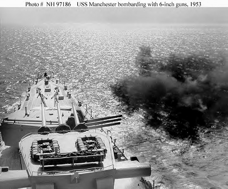USS Manchester (CL 83) returns enemy counter-battery fire with her forward turret's 6"/47 guns, while operating off the North Korean east coast, March 1953. Note life rafts and floater nets stowed atop turret two. Official U.S. Navy Photograph, from the collections of the Naval Historical Center #NH 97186. |