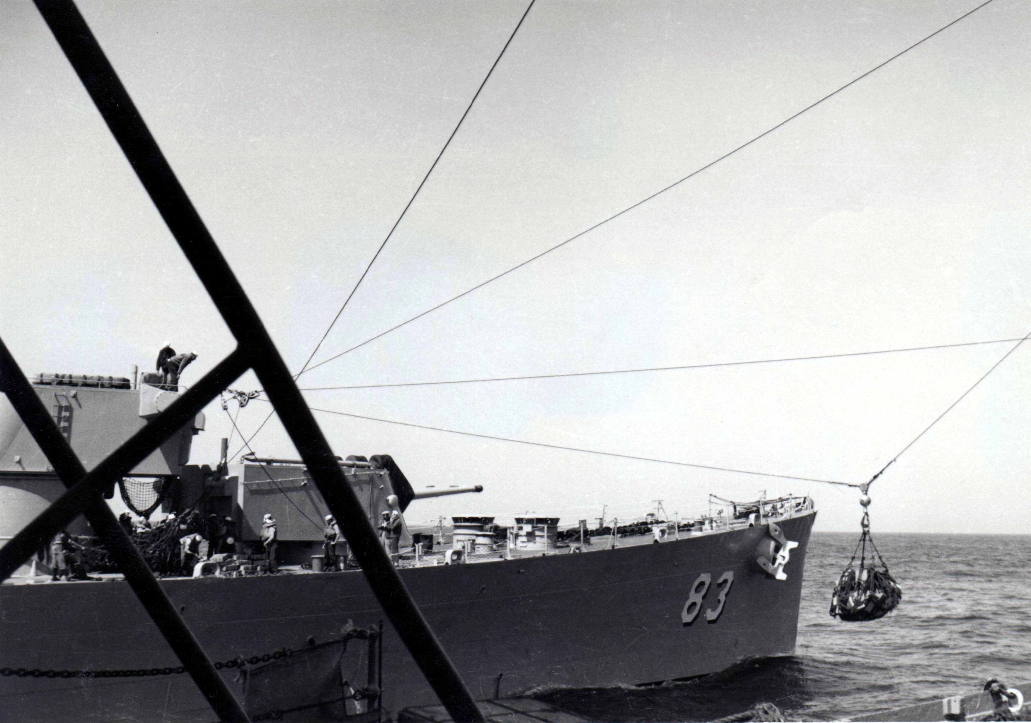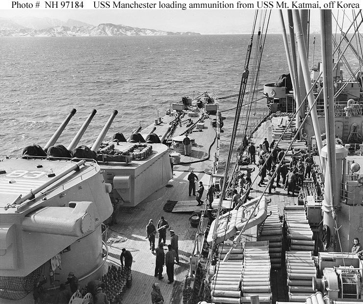 USS Manchester (CL 83) Replenishing ammunition while alongside USS Mount Katmai (AE 16) in Wonsan harbor, North Korea, within sight of enemy gun batteries, circa early 1951. Note projectiles on deck on both ships, powder tanks stacked on Mount Katmai, and wooden planks laid on Mount Katmai's decks. It appears that projectiles are being brought on board Manchester, while empty powder tanks are being carried off of her. Projectiles are being hoisted into Manchester's turret number two (in lower left). Photo was received by the Naval Photographic Center on 3 MAY 1951. Official U.S. Navy Photograph, from the collections of the Naval Historical Center #NH 97184. |