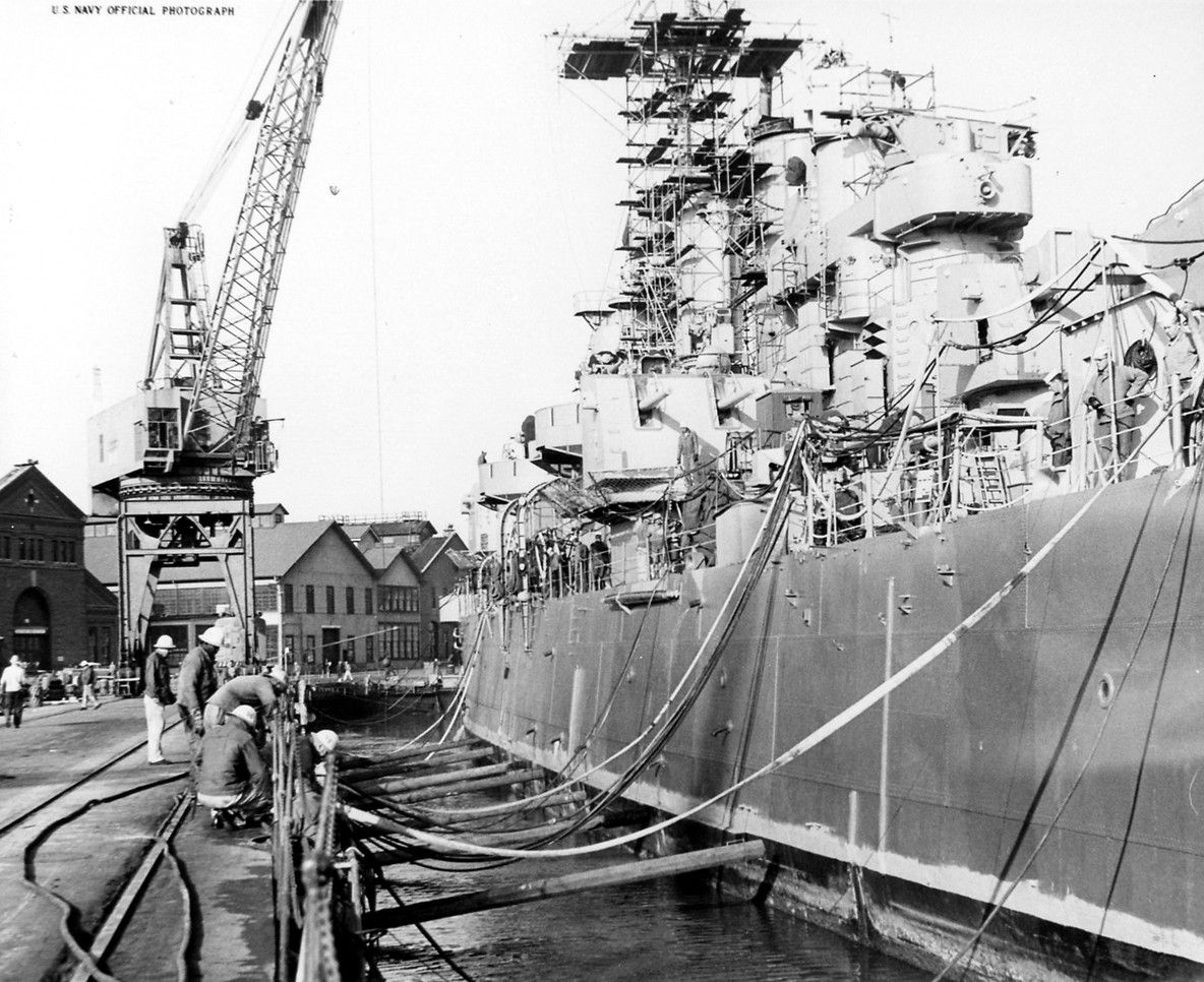 Port side view of USS Manchester (CL 83) in dry dock #2 at Mare Island on 17 December 1954. U.S. Navy Photo #24003-12-54 |