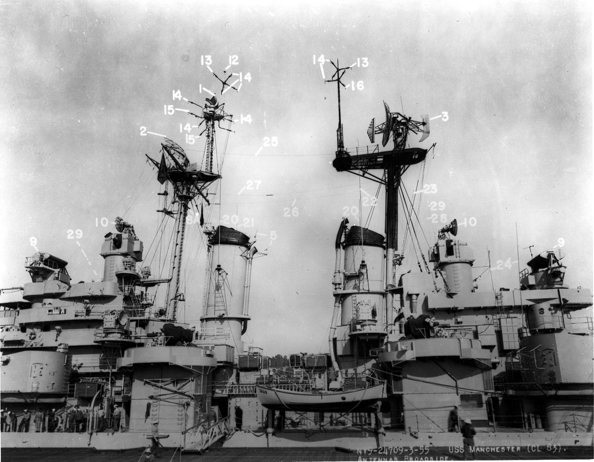 Port side view identifying numerous antennas. U.S. Navy Photo #NY9-24709-3-55 |