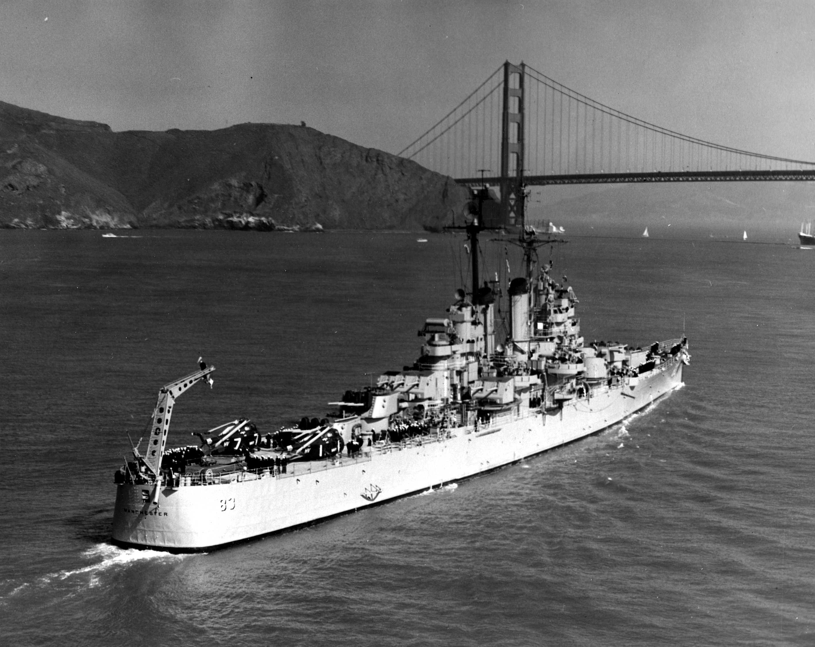 398k | USS Manchester (CL 83) heading into San Francisco Bay with the Golden Gate Bridge in the distance. Photo is stamped, "Official USN Photograph, N.A.S. Alameda", and also stamped, "RECEIVED EXAMINER REFERENCE LIBRARY FEB. 21 1954", from the San Francisco Examiner files. | David Buell | |