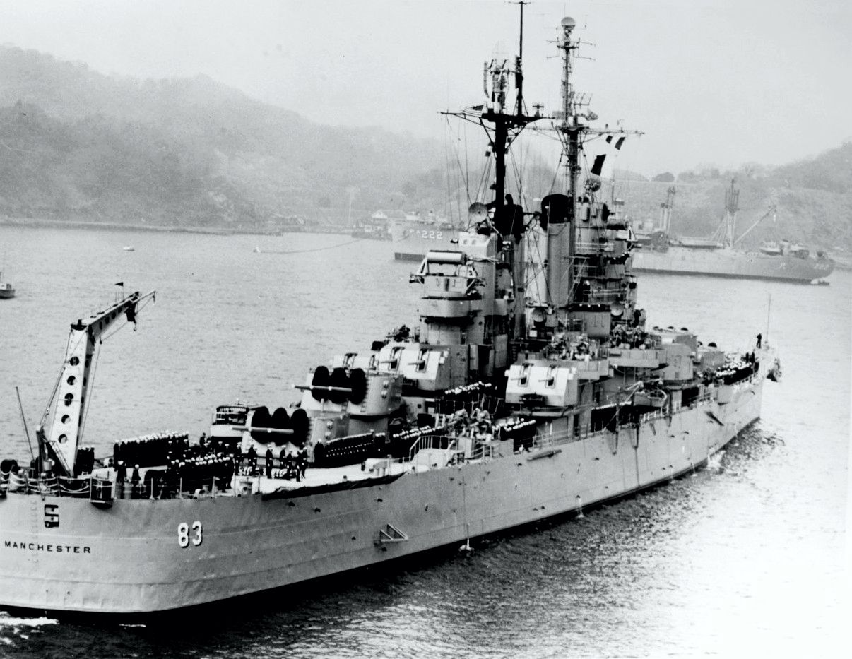 USS Manchester (CL 83) Underway in August 1950, possibly while en route to join the Seventh Fleet for Korean War combat operations. Photographed by Ph1 Hugh Le Gros, USN. Official U.S. Navy Photograph, from the collections of the Naval Historical Center #NH 97181. |