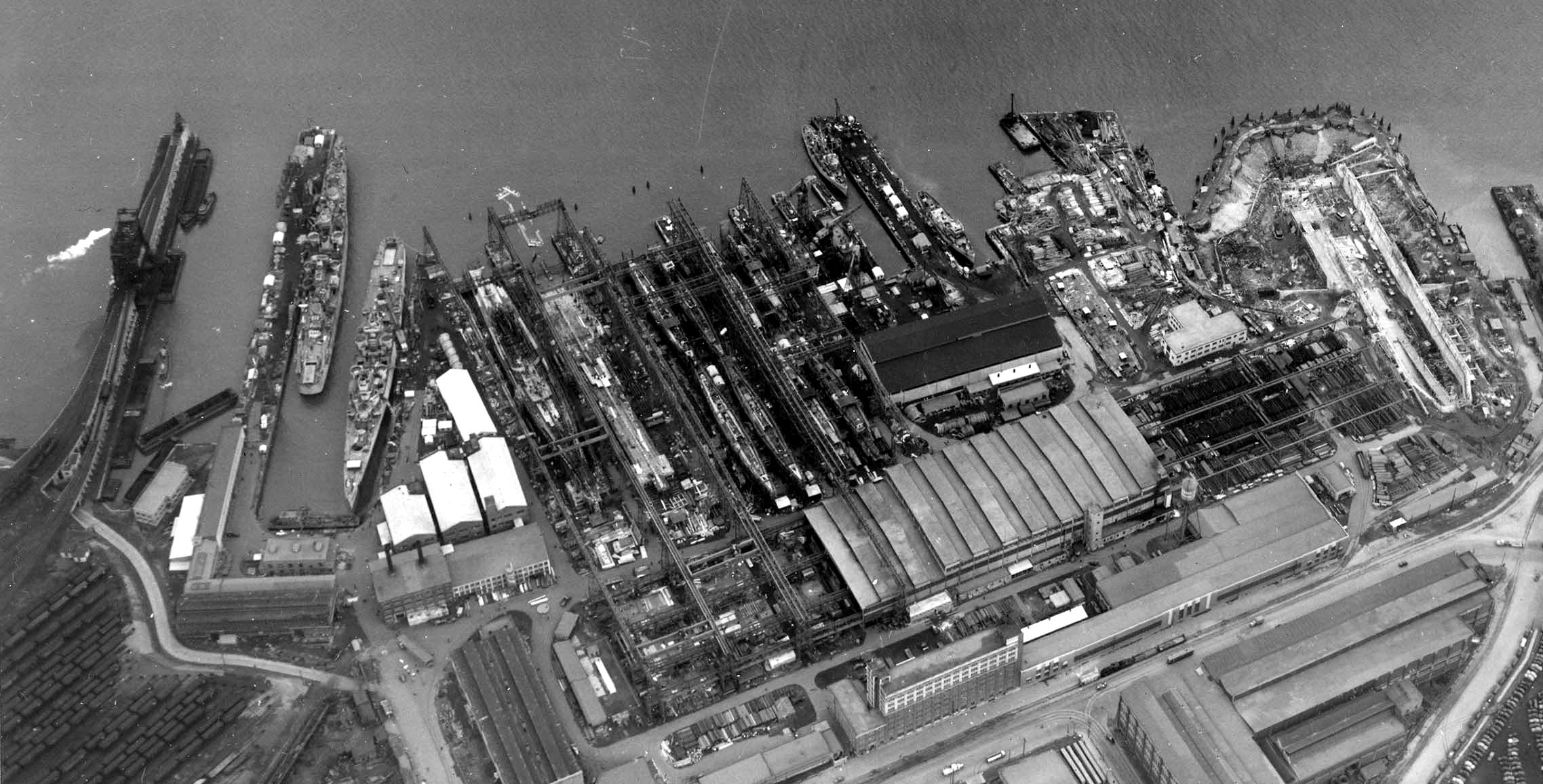 catapults in place. Note the 8 submarines in various stages of construction to the left of the Little Rock (4 per shipway). They are most likely: Devilfish