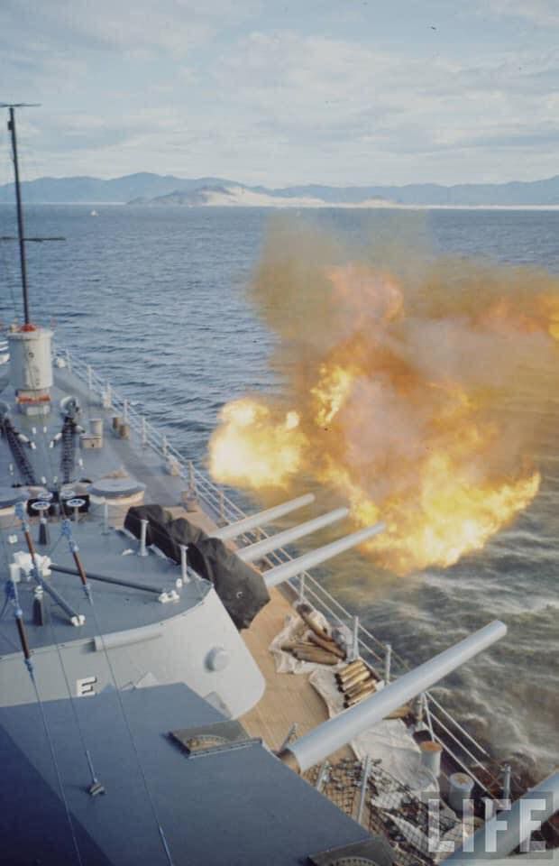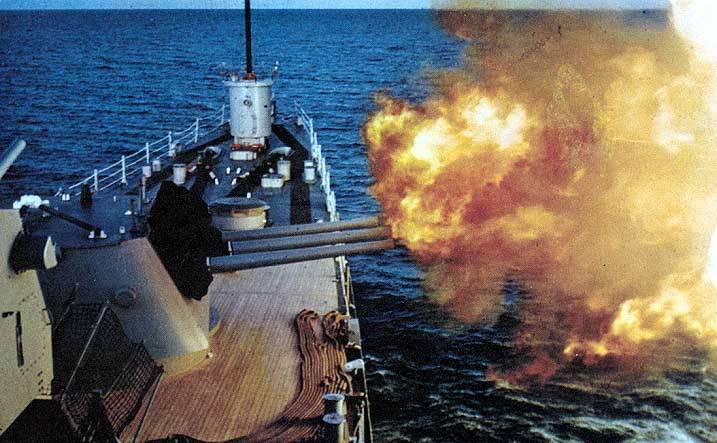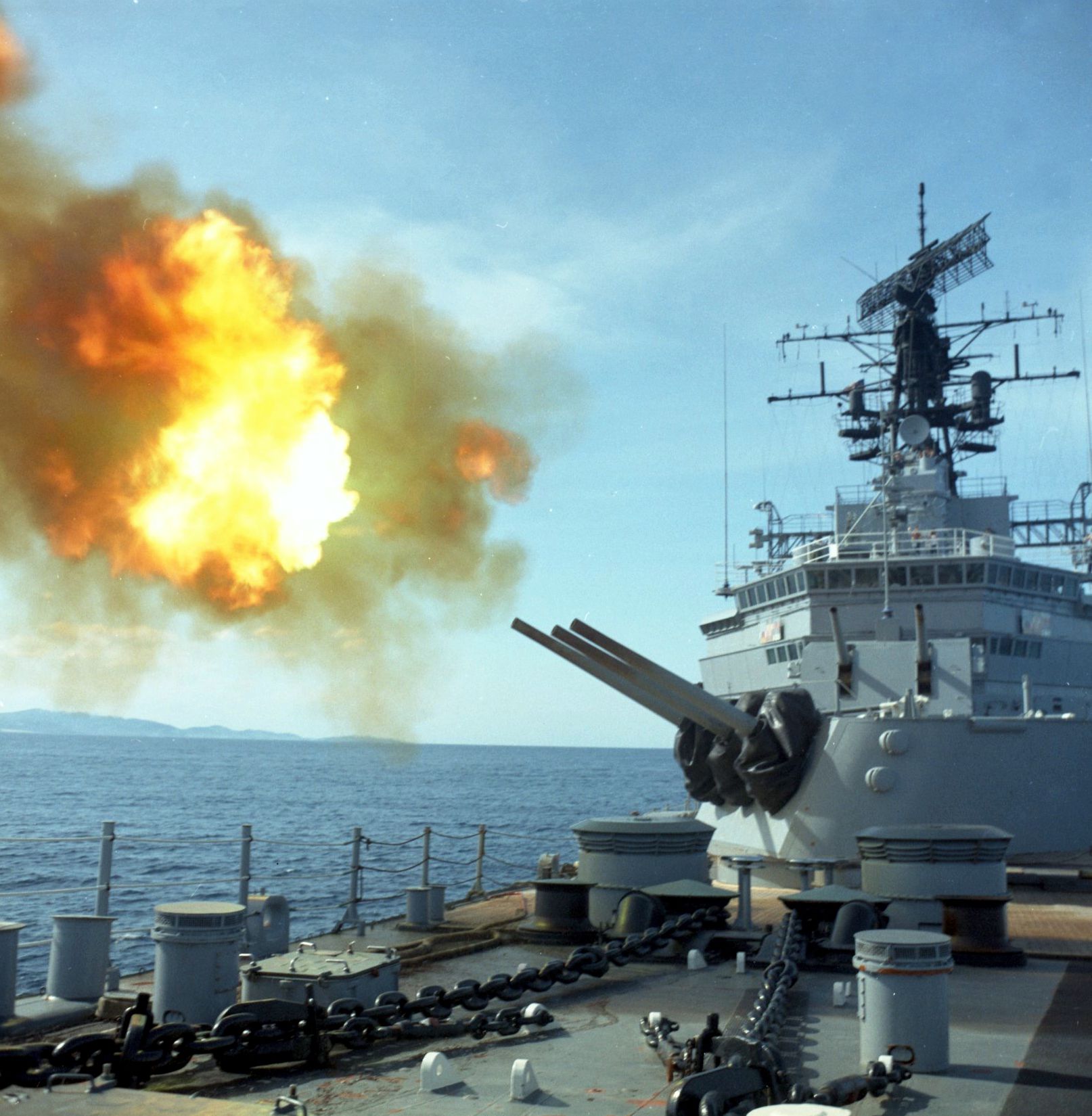 308k | USS Oklahoma City (CLG 5) fires its 6-inch/47-caliber guns at enemy targets in this August 1972 photograph. The cruiser was providing fire support for ARVN troops. | Yu Chu | |