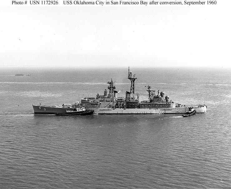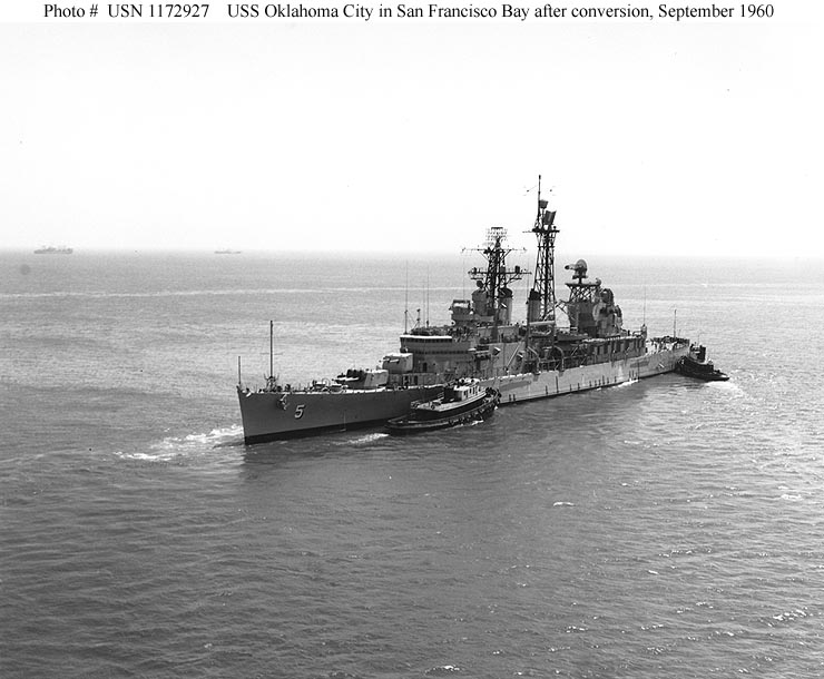 USS Oklahoma City (CLG 5) Is tugged from the Bethlehem Steel Company's San Francisco, California, shipyard to the Hunters Point Naval Shipyard, following her conversion to a guided missile cruiser, September 1960. Official U.S. Navy Photograph #USN 1172927. |
