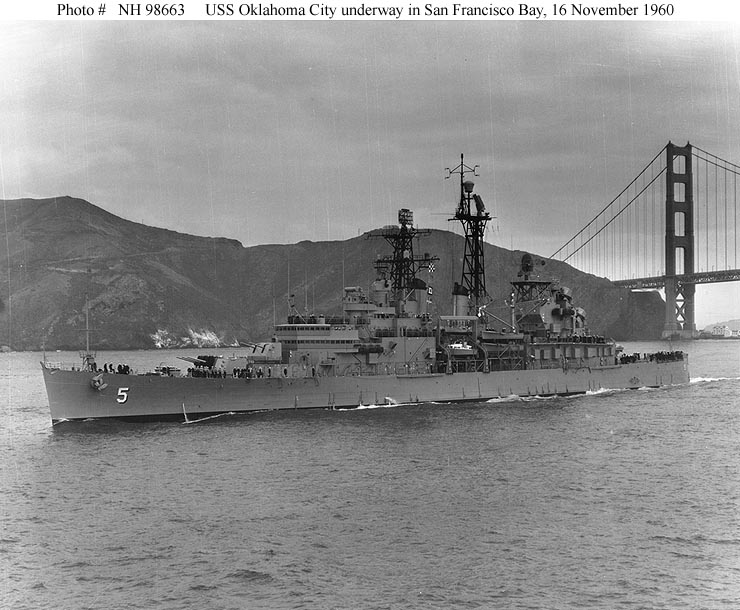 USS Oklahoma City (CLG 5) Steams out of San Francisco Bay, California, on 16 November 1960. Photographed by Naval Air Station Alameda, California. Official U.S. Navy Photograph, from the collections of the Naval Historical Center #NH 98663. |