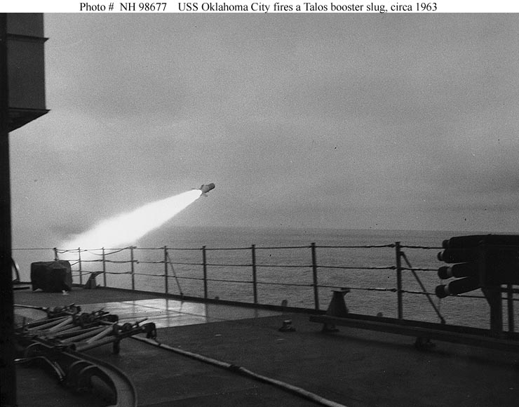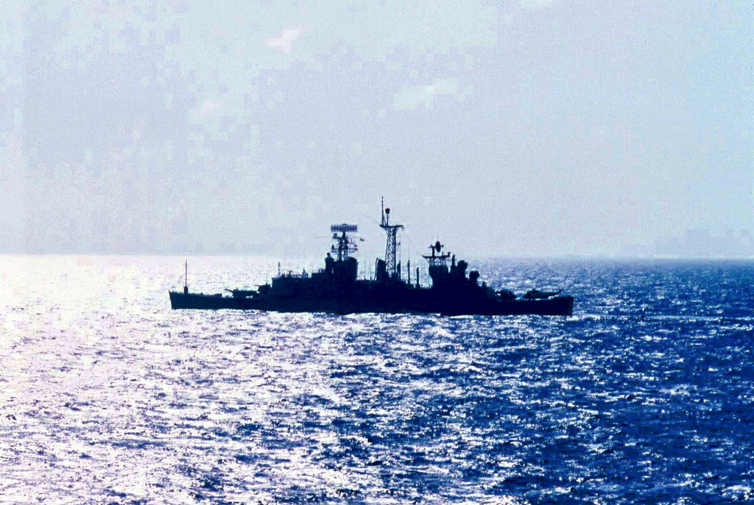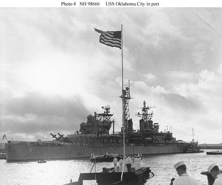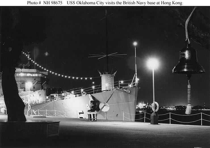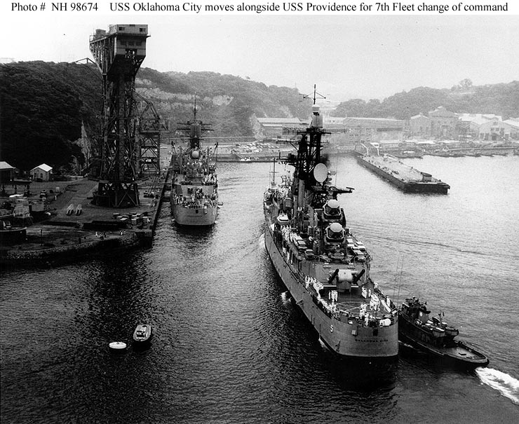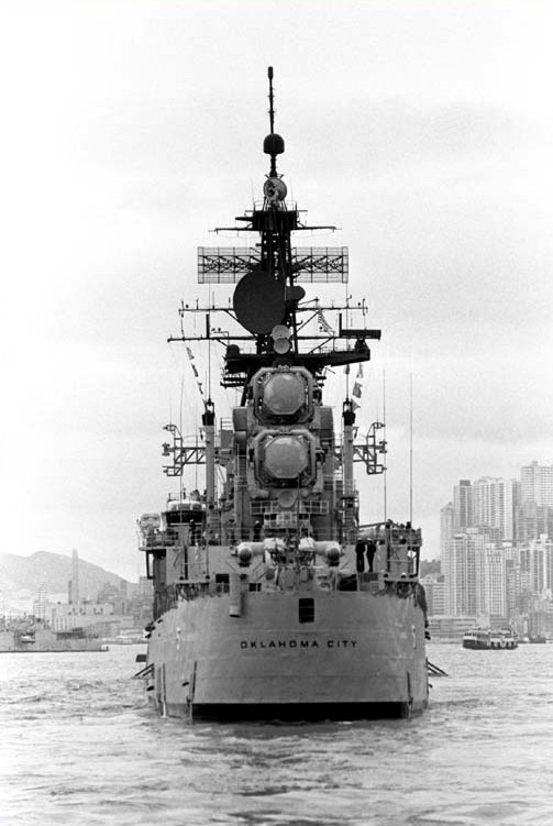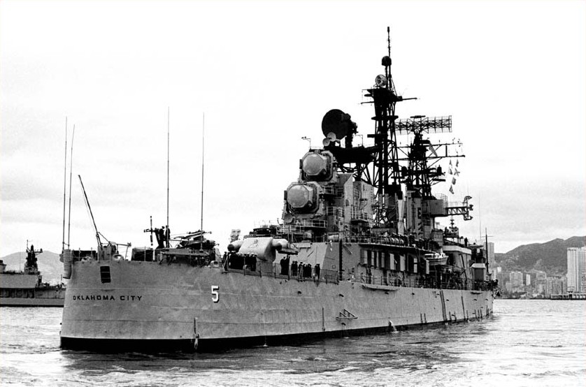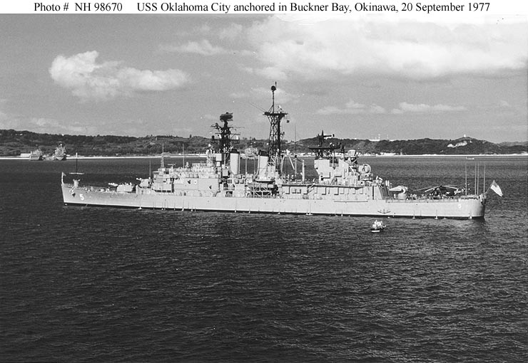 USS Oklahoma City (CG 5) Anchored in Buckner Bay, Okinawa, 20 September 1977. The ship is part of Task Force 77, taking part in Operation Bayanihan IV Fortress Lightning, a joint U.S. Navy, U.S. Marine Corps and Republic of the Philippines Armed Forces exercise. Photographed by PH1 William L. Rodgers. Official U.S. Navy Photograph, from the collections of the Naval Historical Center #NH 98670. |