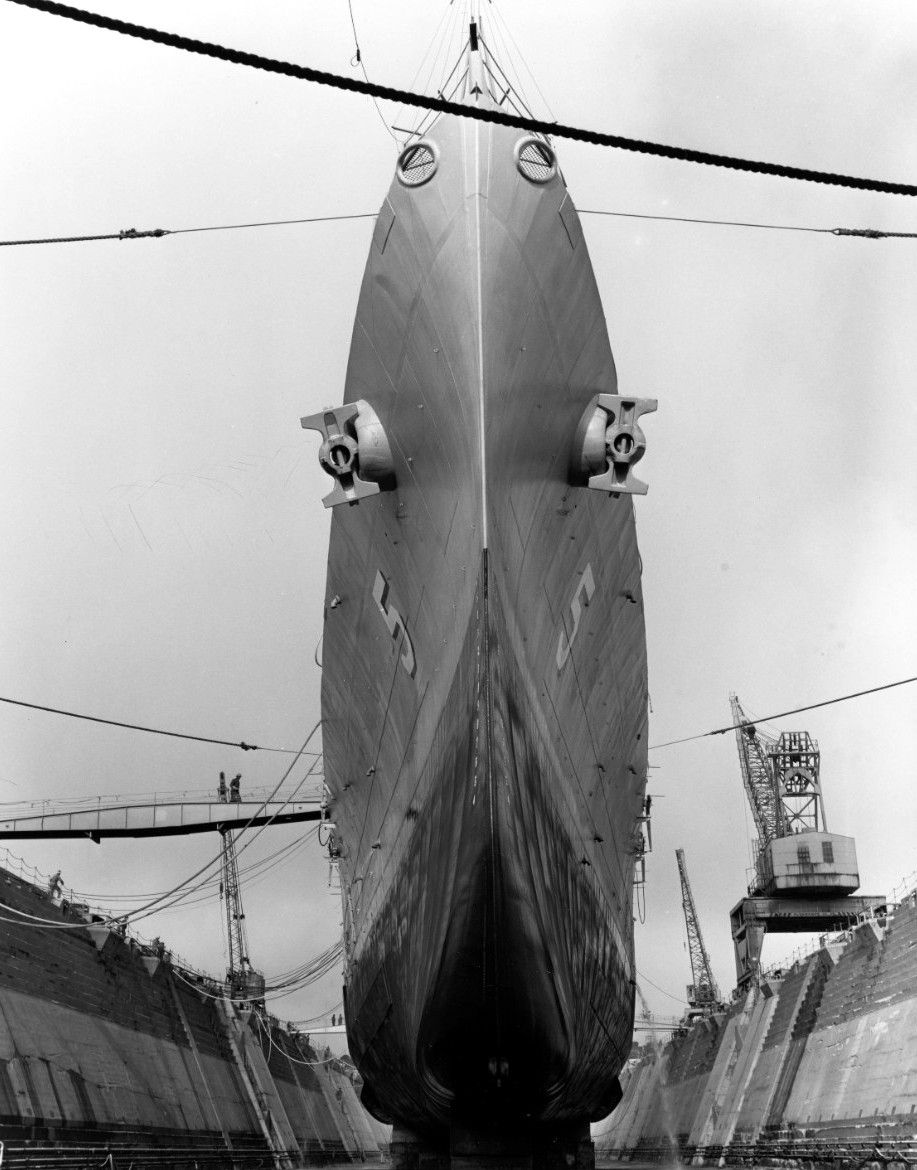 1m | Port bow view just prior to entering dry dock #2 at Mare Island on 26 October 1946. | Darryl Baker | |