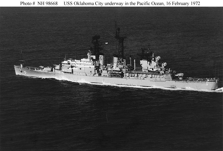 USS Oklahoma City (CLG 5) Underway in the Pacific Ocean, 16 February 1972. Official U.S. Navy Photograph, from the collections of the Naval Historical Center #NH 98668. |
