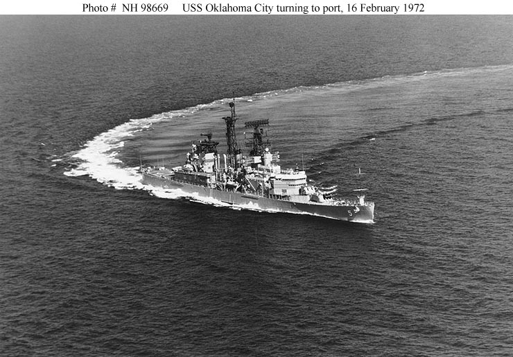USS Oklahoma City (CLG 5) Makes a tight turn to port while steaming in the Pacific Ocean, 16 February 1972. Official U.S. Navy Photograph, from the collections of the Naval Historical Center #NH 98669. |
