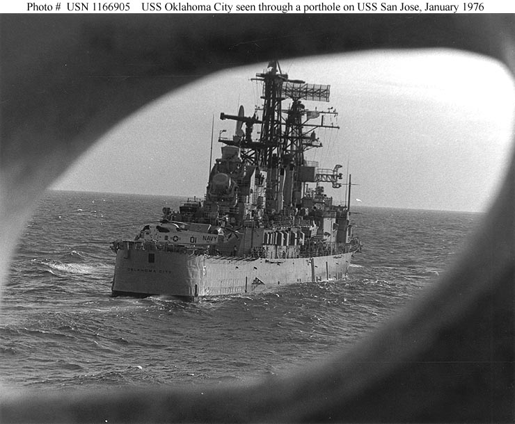 USS Oklahoma City (CG 5) Seen through a porthole on USS San Jose (AFS 7), January 1976. Photographed by PH1 J.R. Sheppard, USN. Note SH-3 helicopter on Oklahoma City's fantail. Official U.S. Navy Photograph #USN 1166905. |