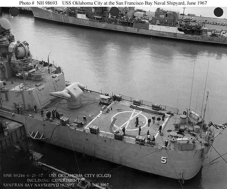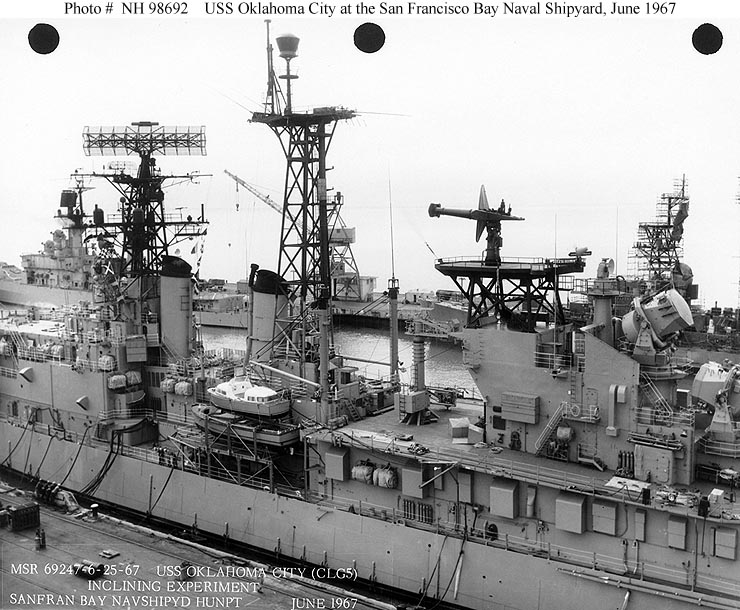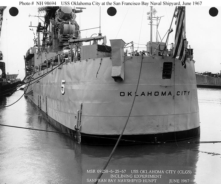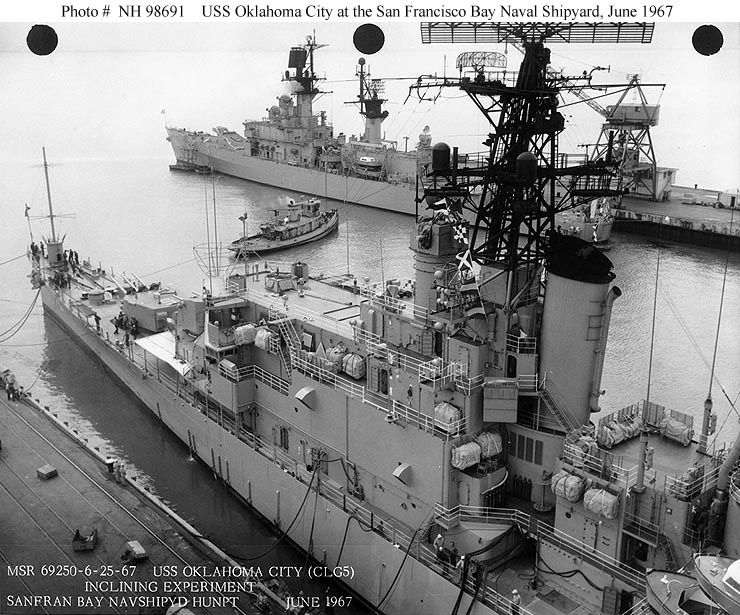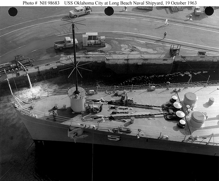 USS Oklahoma City (CLG 5) In drydock at the San Francisco Naval Shipyard, 20 June 1961. Photographed by PH1 N.A. Archey, USN. Official U.S. Navy Photograph, from the collections of the Naval Historical Center #NH 98672. |