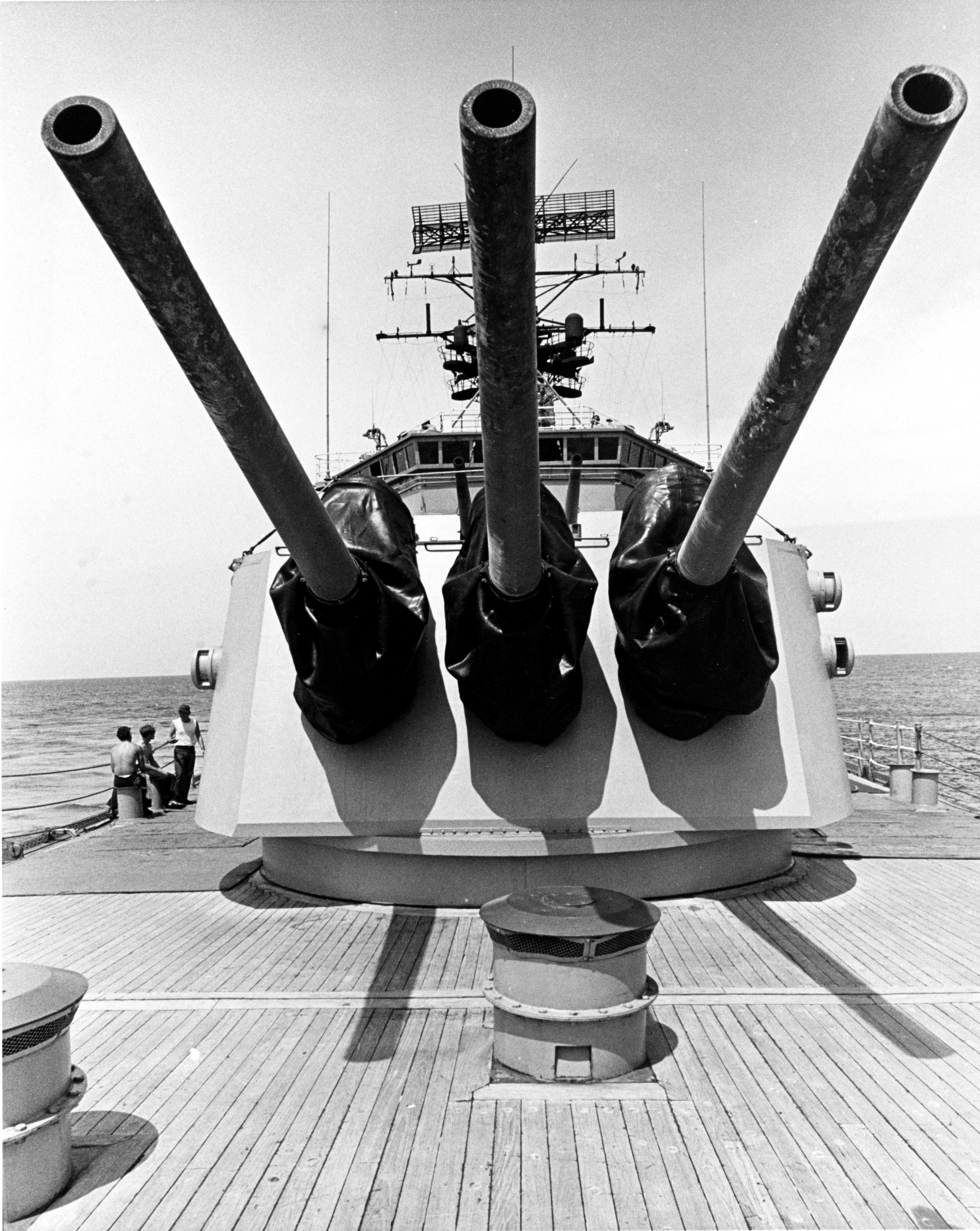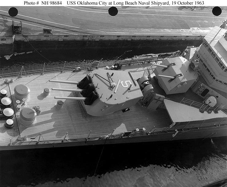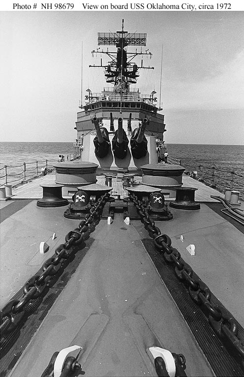 USS Oklahoma City (CLG 5) View from the ship's foredeck, looking aft at her gun battery and forward superstructure, with anchor chains in the foreground. Photograph was received in August 1972. It was probably taken during naval gunfire support operations off Vietnam earlier that year, as the paint on the ship's 6"/47 gun barrels appears to be charred and blistered from the heat of firing. Official U.S. Navy Photograph, from the collections of the Naval Historical Center #NH 98679. |