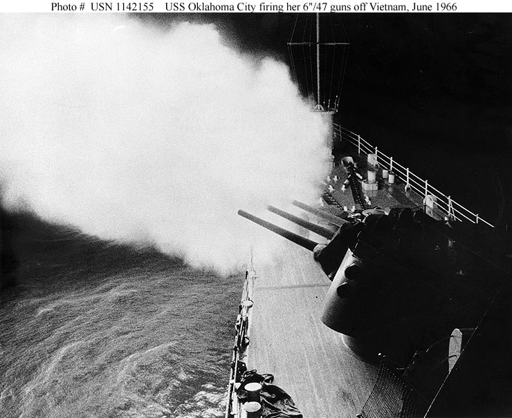 USS Oklahoma City (CLG 5) View of the ship's 6"/47 guns. Photograph was received in August 1972 and was probably taken during naval gunfire support operations off Vietnam earlier in that year as the paint on the gun barrels is charred and blistered from the heat of firing. Official U.S. Navy Photograph, from the collections of the Naval Historical Center #NH 98680. |