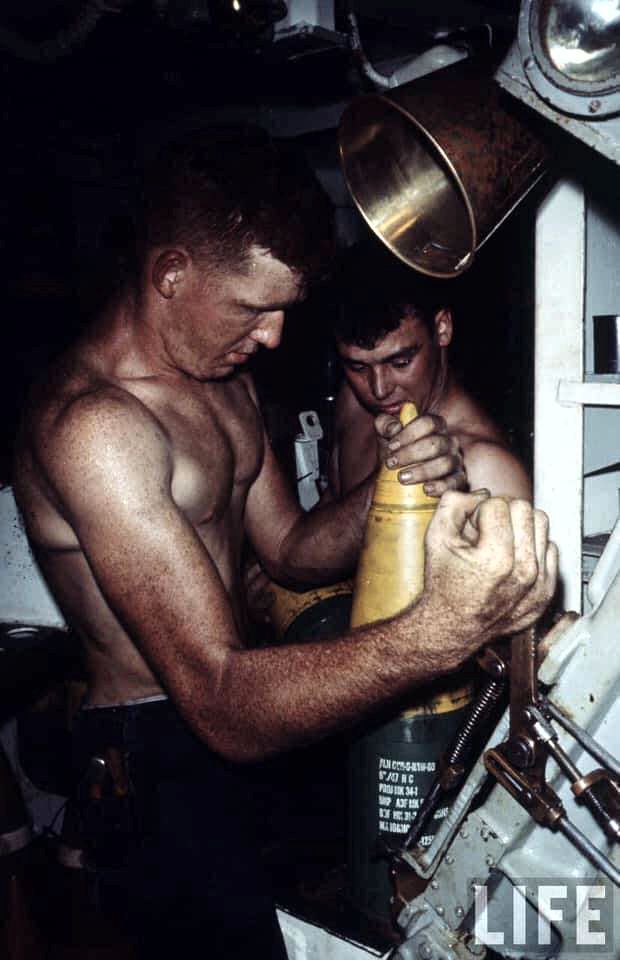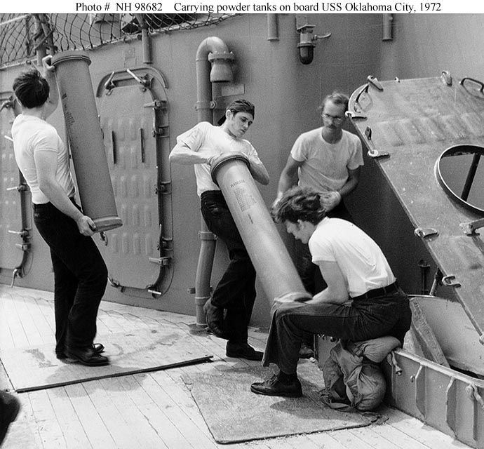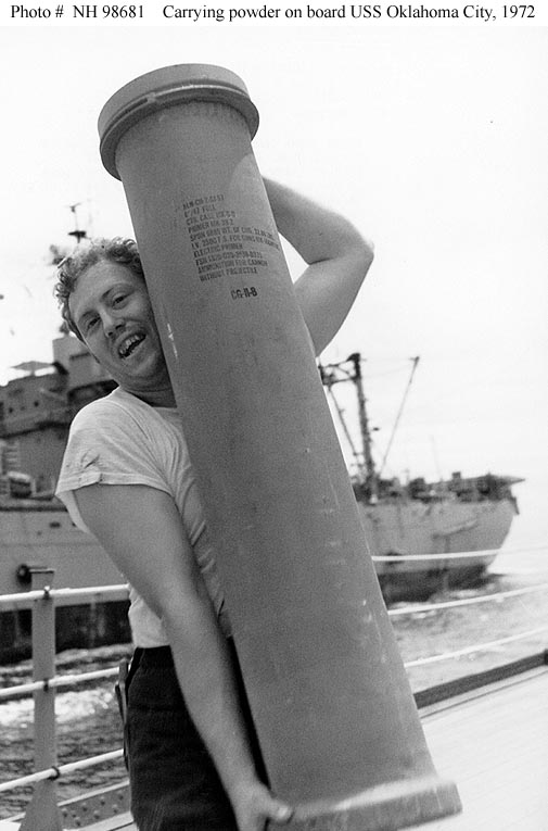 Crewman carries a gunpowder tank for the ship's 6"/47 guns, during underway replenishment operations in the South China Sea, 3 August 1972. Official U.S. Navy Photograph, from the collections of the Naval Historical Center #NH 98681. |