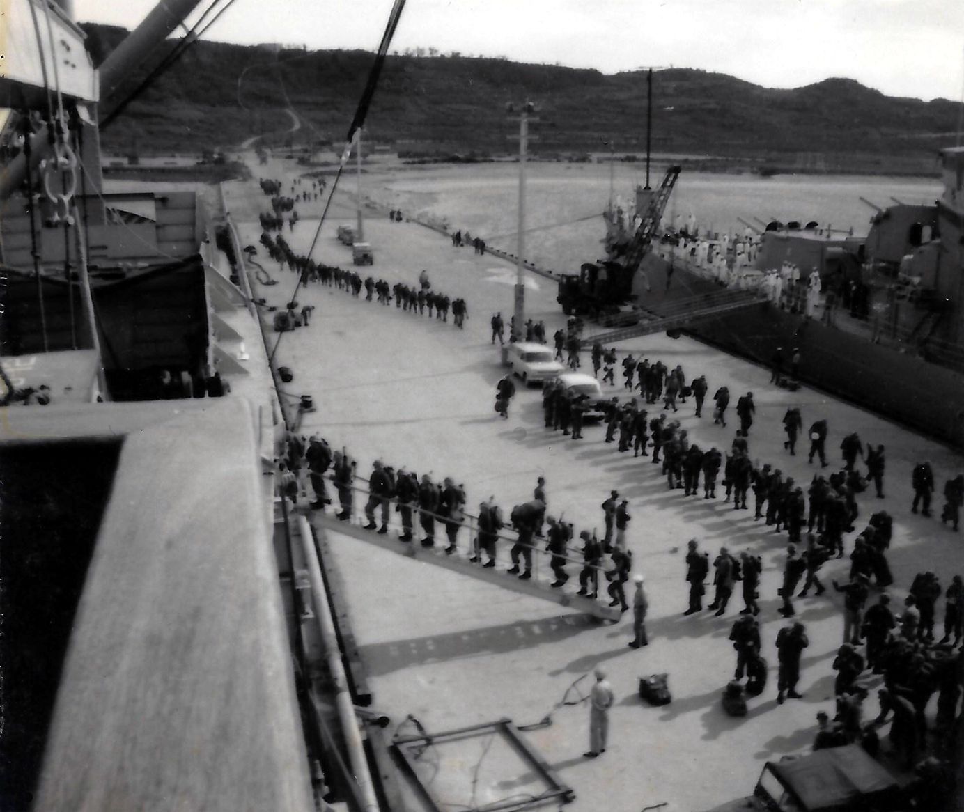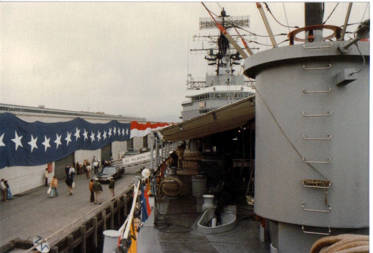 108k | Moored at Pearl Harbor, HI, 18 October 1979 with friendship lights lit. The "Okie Boat" was on her way to San Diego for decommissioning after serving as Flagship of the Seventh Fleet for eleven years. This picture was taken from the roof of the old Enlisted Barracks, which has since been torn down. | Tom Bateman | |