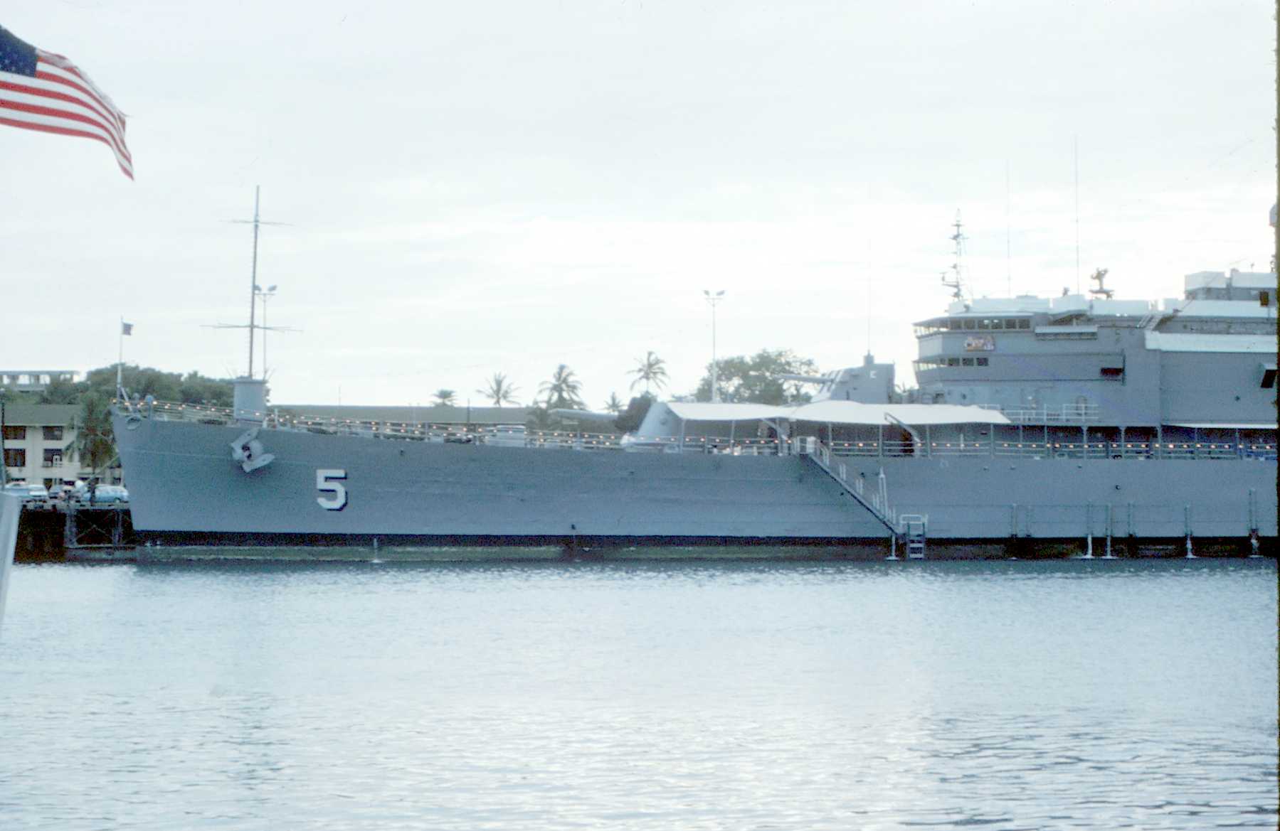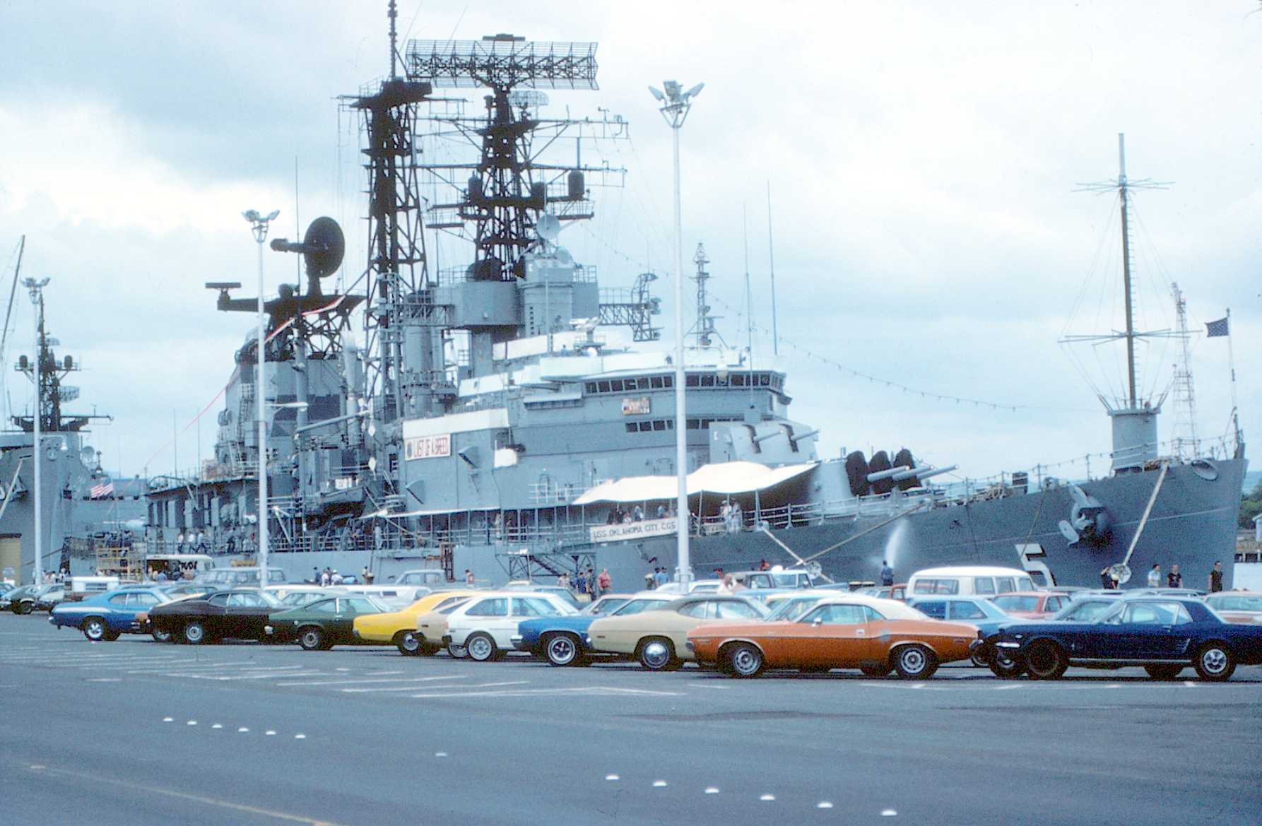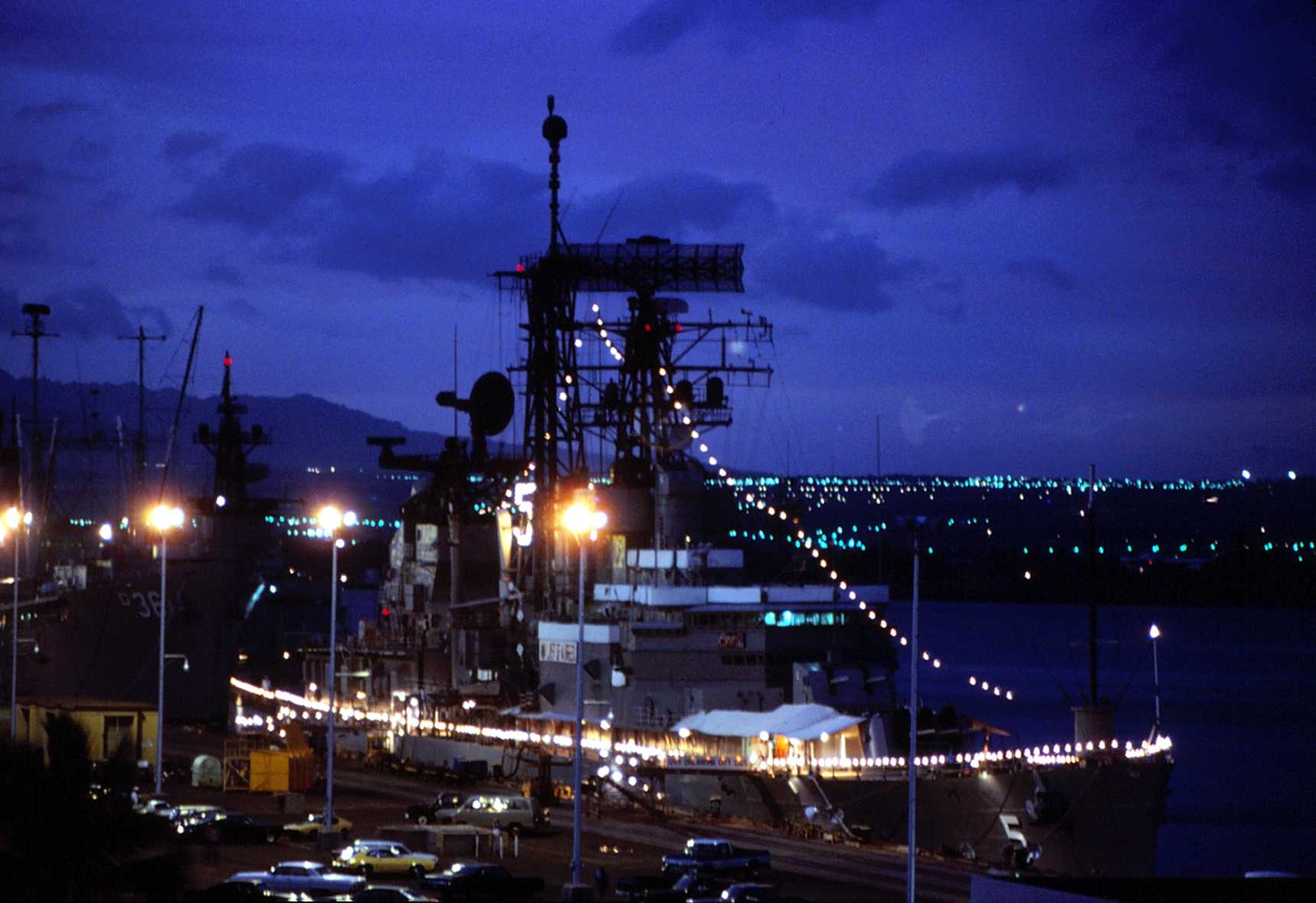 117k | Moored at Pearl Harbor, HI, 18 October 1979 with friendship lights lit. The "Okie Boat" was on her way to San Diego for decommissioning after serving as Flagship of the Seventh Fleet for eleven years. This picture was taken from the roof of the old Enlisted Barracks, which has since been torn down. | Tom Bateman | |