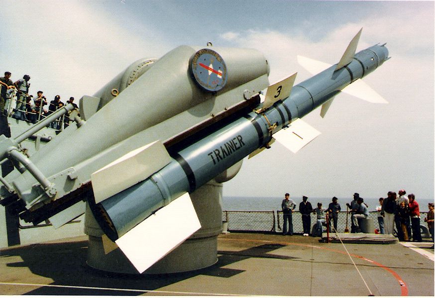 112k | Talos training missiles (T-SAM) on the launcher in 1979. This view shows the Emergency Igniter Injector assembly on the top aft portion of the launcher arm. This would be used in a combat situation to clear a missile that did not launch due to a failure within the booster. | Christopher Eger | |