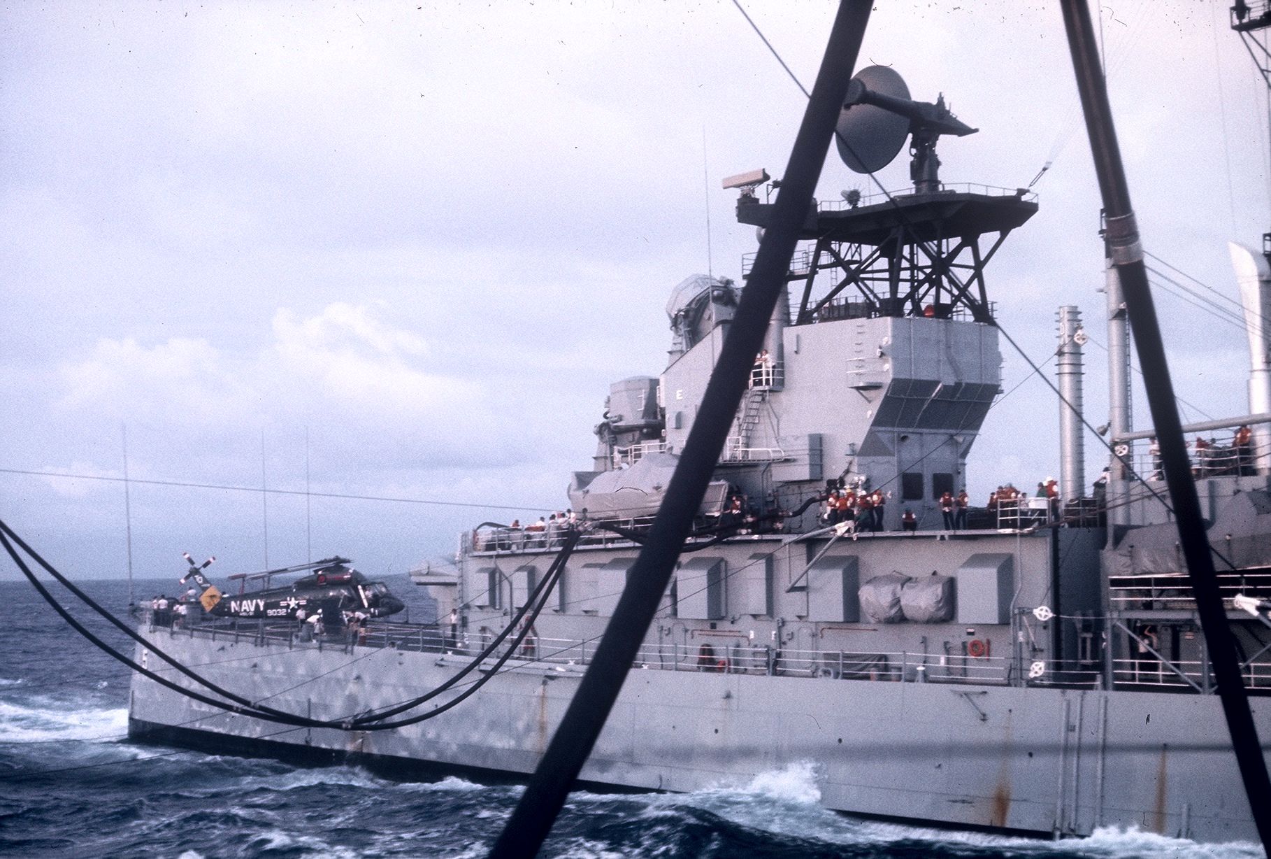 392k | USS Oklahoma City (CLG 5) during unrep with the USS Ashtabula (AO 51), taken during the Ashtabula's WESTPAC 1971-72 cruise. Note the Seasprite Helicopter on the fantail. | M. Jay Hatley | |