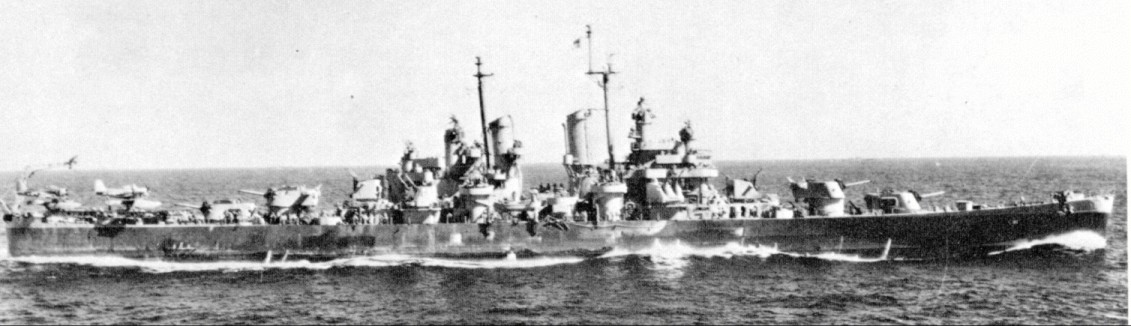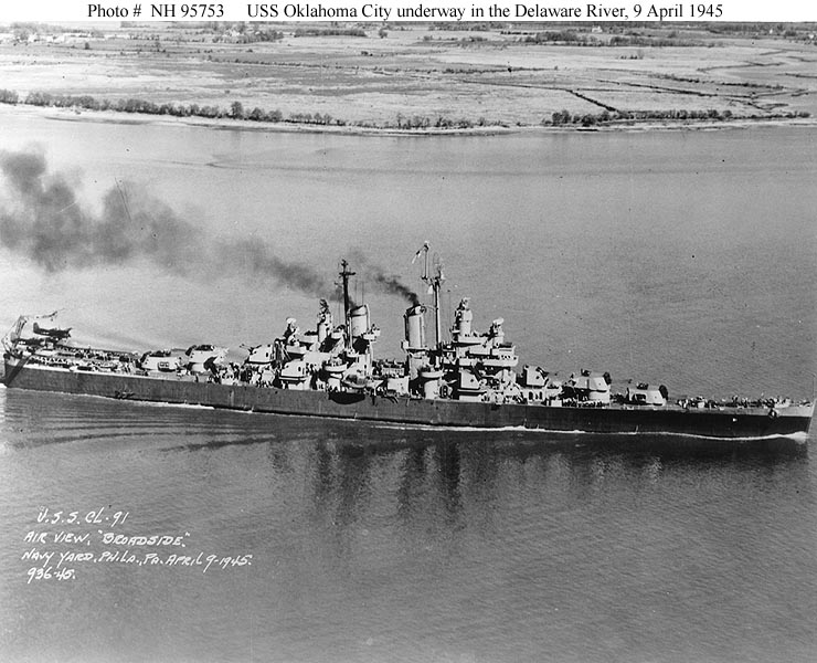 USS Oklahoma City (CL 91) Underway in the Delaware river, while operating out of the Philadelphia Navy Yard, Pennsylvania, 9 April 1945. Courtesy of the U.S. Naval Institute, Annapolis, Maryland. Collection of James C. Fahey. Official U.S. Navy Photograph, from the collections of the Naval Historical Center #NH 95753. |