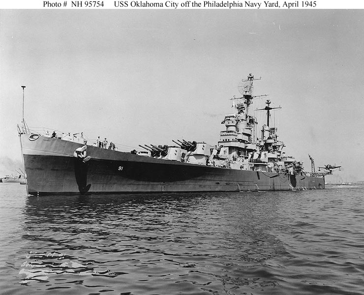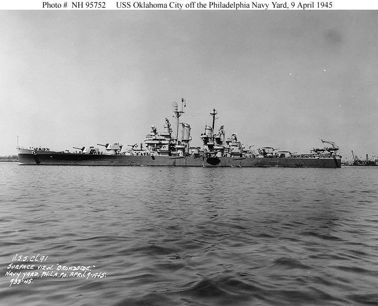 USS Oklahoma City (CL 91) Off the Philadelphia Navy Yard, Pennsylvania, circa 9 April 1945. Courtesy of the U.S. Naval Institute, Annapolis, Maryland. Collection of James C. Fahey. Official U.S. Navy Photograph, from the collections of the Naval Historical Center #NH 95754. |