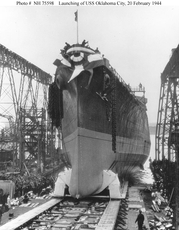 Oklahoma City (CL 91) Launching, at the Cramp shipyard, Philadelphia, Pennsylvania, 20 February 1944. Courtesy of James Russell, 1972. U.S. Naval Historical Center Photograph #NH 75598. |