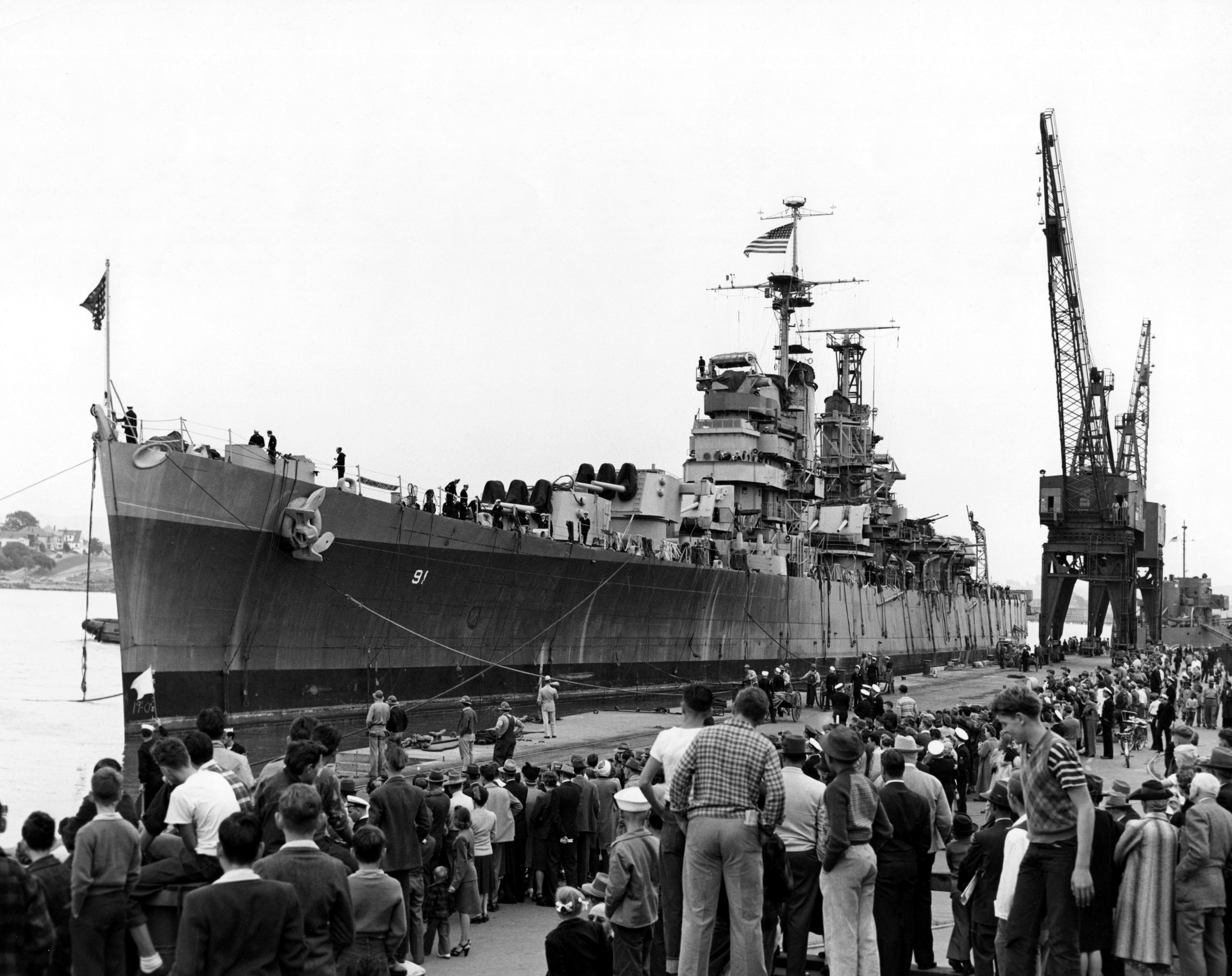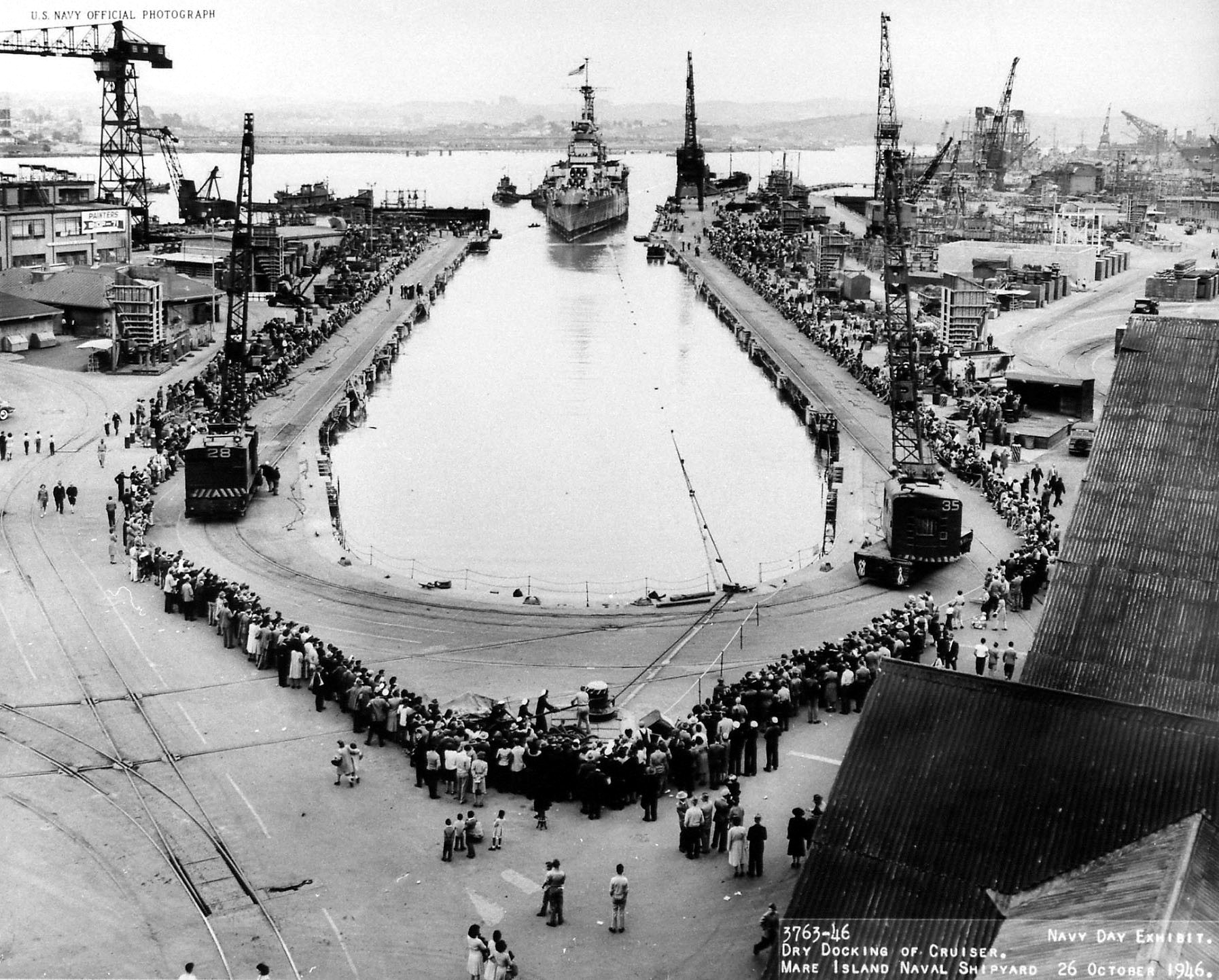 The Oklahoma City (CL 91) enters dry dock #2 at Mare Island Naval Shipyard on 26 Oct 1946 during the yard's Navy Day celebration. She was in dry dock from 26 Oct to 13 Nov 1946. |