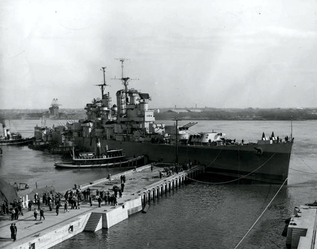 Oklahoma City (CL 91) being assisted by tugs at the Philadelphia Navy Yard on 16 December 1944, one week before her 22 December commissioning. Built by the Cramp Shipbuilding Co., her commissioning will be the second Cramp built light cruiser commissioned in a two week span. Source: Philadelphia Evening Bulletin, George D. McDowell Collection. |