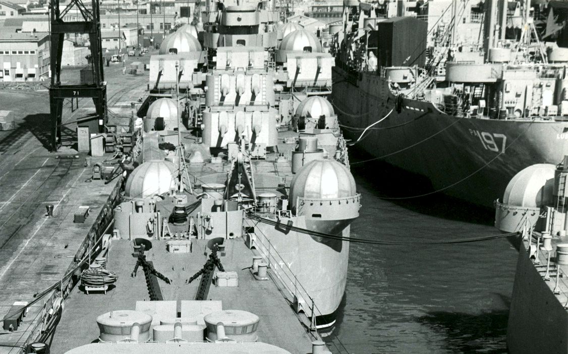 USS Oklahoma City as seen in a Pacific Reserve Force nest at Mare Island, CA, 11 September 1947. SF Museum 2374. |