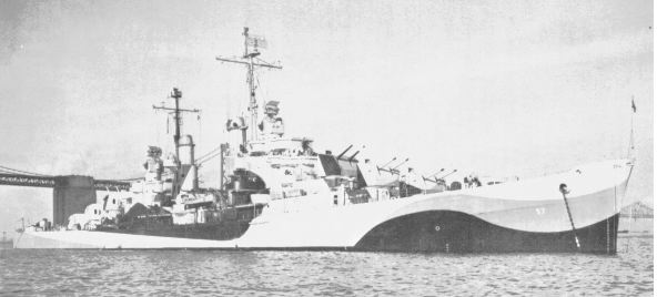 Camouflage Measure 33, Design 22D (Port side) Drawing prepared by the Bureau of Ships for a camouflage scheme intended for light cruisers of the CL-51 (Atlanta) class. This plan, approved by Captain Torvald A. Solberg, USN, is dated 18 April 1944. It shows the ship's port side. USS San Juan (CL 54) and USS Flint (CL 97) were painted in this camouflage pattern, though photographs of the ships indicate that the paints actually used were the darker colors of Measure 32 (Dull Black, Ocean Gray and Light Gray) rather than the Measure 33 paints (Navy Blue, Haze Gray and Pale Gray) shown in this drawing. Official U.S. Navy Photograph, now in the collections of the National Archives. Official U.S. Navy Photograph #80-G-173266, now in the collections of the National Archives. |