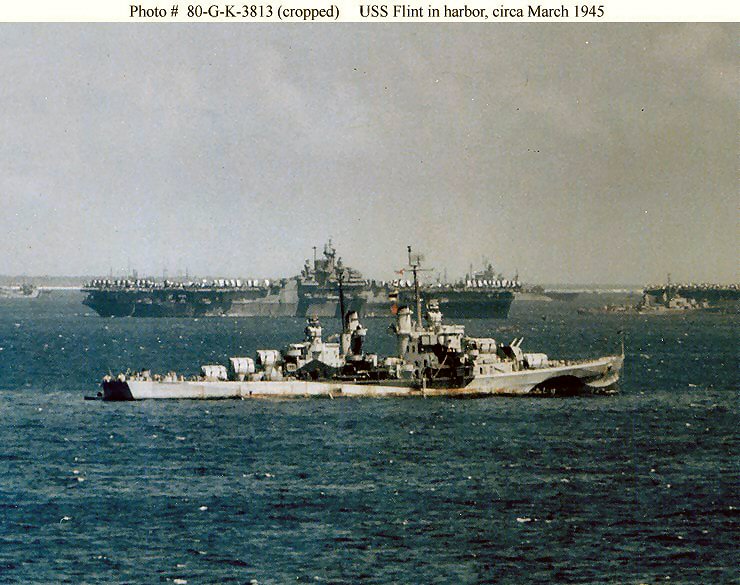 USS Flint (CL 97) At anchor at a western Pacific base, circa mid-1945. Official U.S. Navy Photograph, from the collections of the Naval Historical Center #NH 98513. |