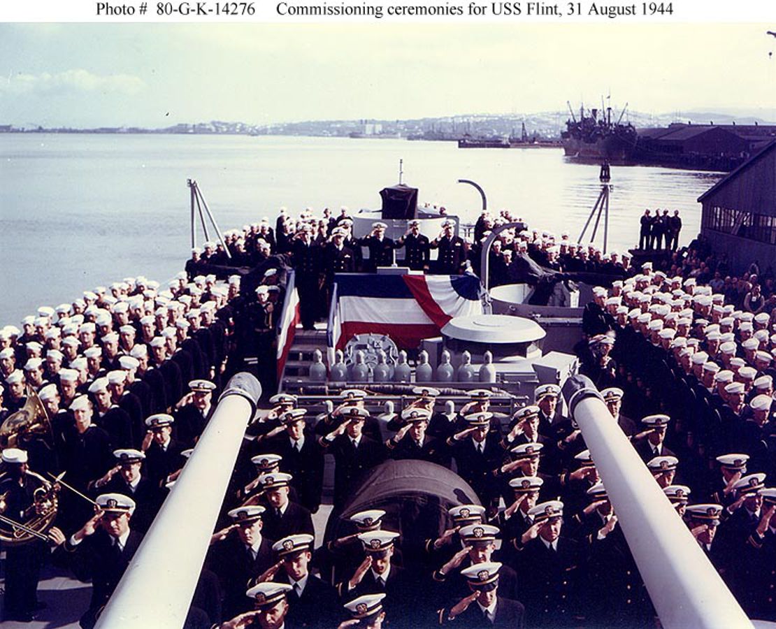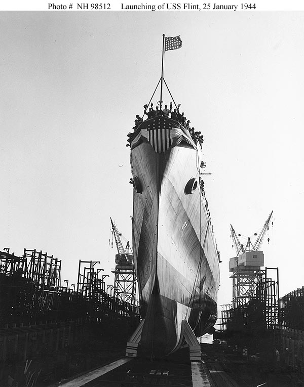 76k | USS Flint (CL 97) Launching, at the Bethlehem Steel Company shipyard, San Francisco, California, 25 January 1944. Official U.S. Navy Photograph, from the collections of the Naval Historical Center #NH 98512. | USNHC | |