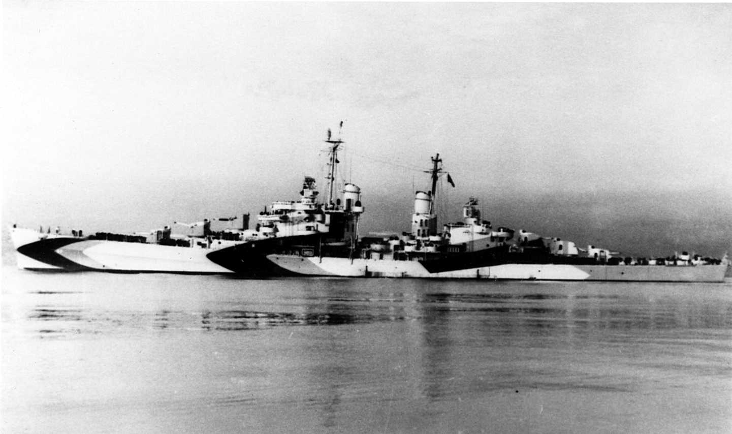 138k | USS Flint (measure 32/22D camoflague) is drilling with USS Putnam (DD 757) in shakedown unrep exercises. View from the USS Putnam set of EM George Hansen, 10 November 1944 operating from San Diego and San Pedro. | Eric Hansen and John Chiquoine | |