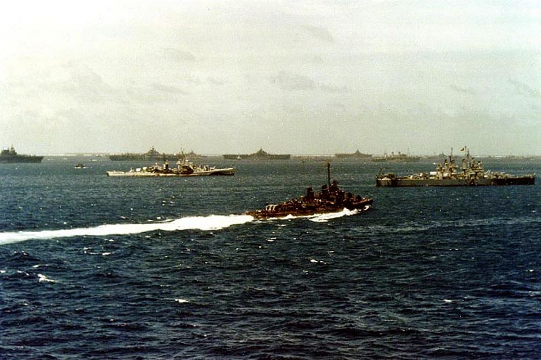 (Low-resolution original that the above photo was cropped from) - U.S. Navy destroyer minelayer USS Shannon (DM 25) steams past task forces gathering at Uithi Atoll for the Okinawa Operation, circa March 1945. Ships in the near background include USS Flint (CL 97), in left center, and USS Miami (CL 89), at right. Three Essex-class aircraft carriers are anchored in the middle distance. USS Enterprise (CV 6) is at the far left. Official U.S. Navy Photograph, now in the collections of the U.S. National Archives. Photo #: 80-G-K-3816 |