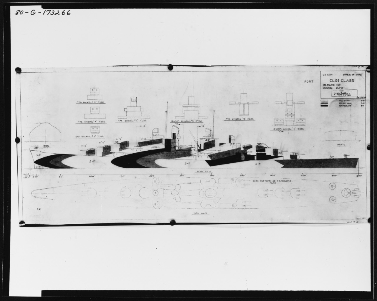 Camouflage Measure 33, Design 22D (Starboard side) Drawing prepared by the Bureau of Ships for a camouflage scheme intended for light cruisers of the CL-51 (Atlanta) class. This plan, approved by Captain Torvald A. Solberg, USN, is dated 18 April 1944. It shows the ship's starboard side, exposed decks and superstructure ends. USS San Juan (CL 54) and USS Flint (CL 97) were painted in this camouflage pattern. However, photographs of the ships indicate that the paints actually used were the darker colors of Measure 32 (Dull Black, Ocean Gray and Light Gray) rather than the Measure 33 paints (Navy Blue, Haze Gray and Pale Gray) shown in this drawing. Official U.S. Navy Photograph #80-G-173267, now in the collections of the National Archives. |