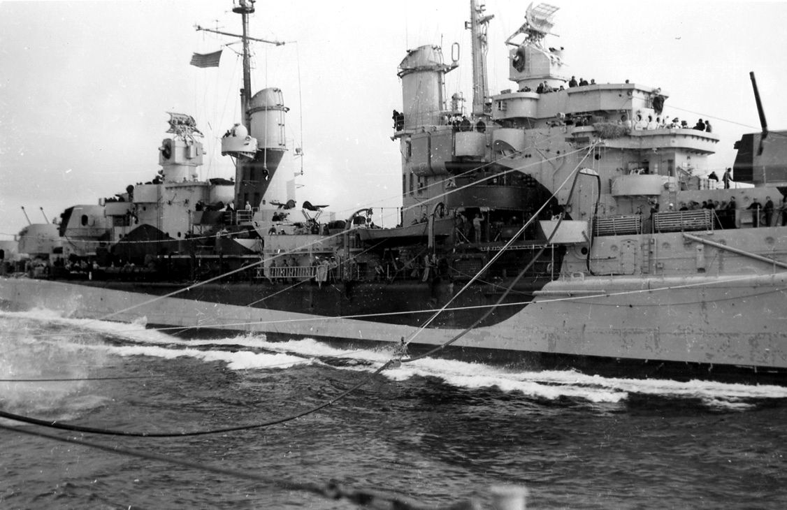 144k | USS Flint (measure 32/22D camoflague) is drilling with USS Putnam (DD 757) in shakedown unrep exercises. View from the USS Putnam set of EM George Hansen, 10 November 1944 operating from San Diego and San Pedro. | Eric Hansen and John Chiquoine | |