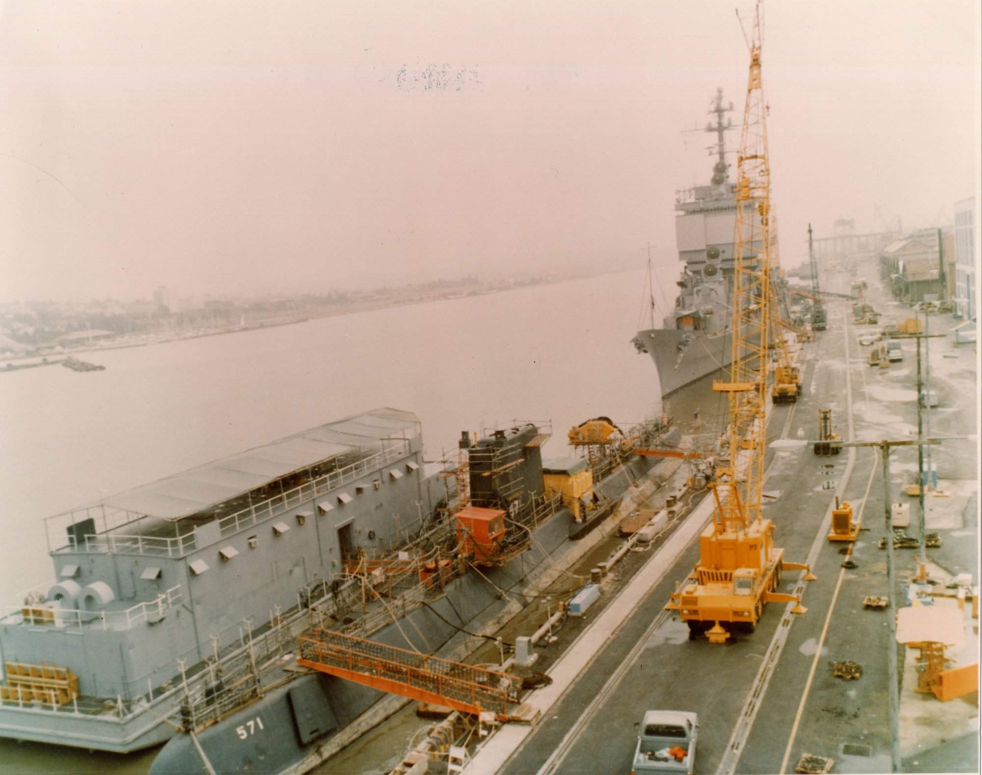 78k | USS Nautilus (SSN 571), and USS Long Beach (CGN 9) at Mare Island Naval Shipyard late 1979, before Long Beach departed for WestPac on 7 January 1980. Nautilus was at the shipyard for inactivation. (date corrected by Gus Bugoyne) US Navy photo #MSA 163841-1-80. |